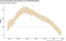 Although Coot are found throughout most of Britain and Ireland, with both resident birds and winter visitors a common sight on shallow water bodies, they can be somewhat elusive, especially during the breeding season and, as a result, are under monitored compared to other species. Although populations have seen increases over the long term, there have been some recent population decreases. These are not currently steep enough to be of concern, though they demonstrate the importance of monitoring this species.