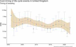 insights into their movements. Though rarely seen in flight, it appears that Coot are a relatively wide-ranging species which move around a lot. Although it is common to see Coot on waterbodies with underwater vegetation, which they feed on, they regularly stand on floating vegetation and walk along the banks of water bodies, so metal and colour rings can be read relatively easily. If you have been thinking about having a go at trapping, Coot would be a great species to start with, as they can be caught quite easily in a baited Potter or walk-in trap. If you are interested in colour ringing Coot, please contact colour. ringing@bto.org in the first instance.