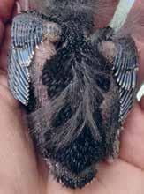 Wing development provides the clearest method for estimating age. On day one (hatch date) and day two, pulli have small pink wings that are often held away from the body. On day three, a thin grey line may be visible along the wing, developing into a thicker grey stripe by day four, indicating the development of feathers below the surface of the skin. By day six or seven, short soft ‘pins’ are often visible, and these develop rapidly (Figure 1).