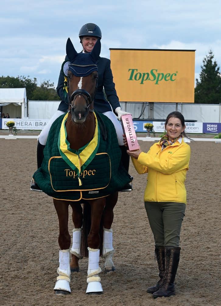 Above and right: Sadie Smith was the standout performer in the Stübben Intermediate II Championship, scoring 74.14% with her own Swanmore Dantina. The pair have had a sensational 12 months, following on from finishing runner-up in the Inter I Gold last year, taking the inter I title at the NAF Magic Winter Championships in April and are now bound for Grand Prix. Swanmore Dantina (Dante Weltino X Charatan W), known as ‘Dia’, is the apple of Sadie’s eye. “She’s always great,” Sadie commented. “I very rarely have a show where she isn’t on form. She goes in with her ears pricked and always tries to do what I want.” They are pictured (right) with Tom Sexton of Stübben.