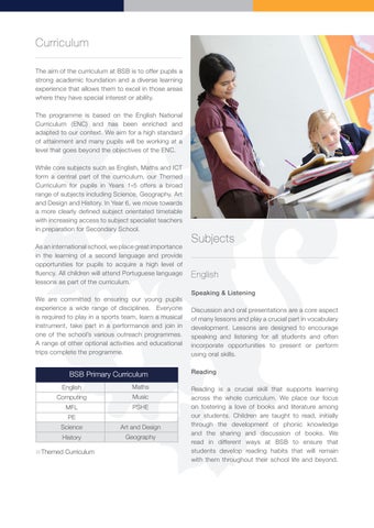 Curriculum The aim of the curriculum at BSB is to offer pupils a strong academic foundation and a diverse learning experience that allows them to excel in those areas where they have special interest or ability. The programme is based on the English National Curriculum (ENC) and has been enriched and adapted to our context. We aim for a high standard of attainment and many pupils will be working at a level that goes beyond the objectives of the ENC. While core subjects such as English, Maths and ICT form a central part of the curriculum, our Themed Curriculum for pupils in Years 1-5 offers a broad range of subjects including Science, Geography, Art and Design and History. In Year 6, we move towards a more clearly defined subject orientated timetable with increasing access to subject specialist teachers in preparation for Secondary School. As an international school, we place great importance in the learning of a second language and provide opportunities for pupils to acquire a high level of fluency. All children will attend Portuguese language lessons as part of the curriculum. We are committed to ensuring our young pupils experience a wide range of disciplines. Everyone is required to play in a sports team, learn a musical instrument, take part in a performance and join in one of the school’s various outreach programmes. A range of other optional activities and educational trips complete the programme.