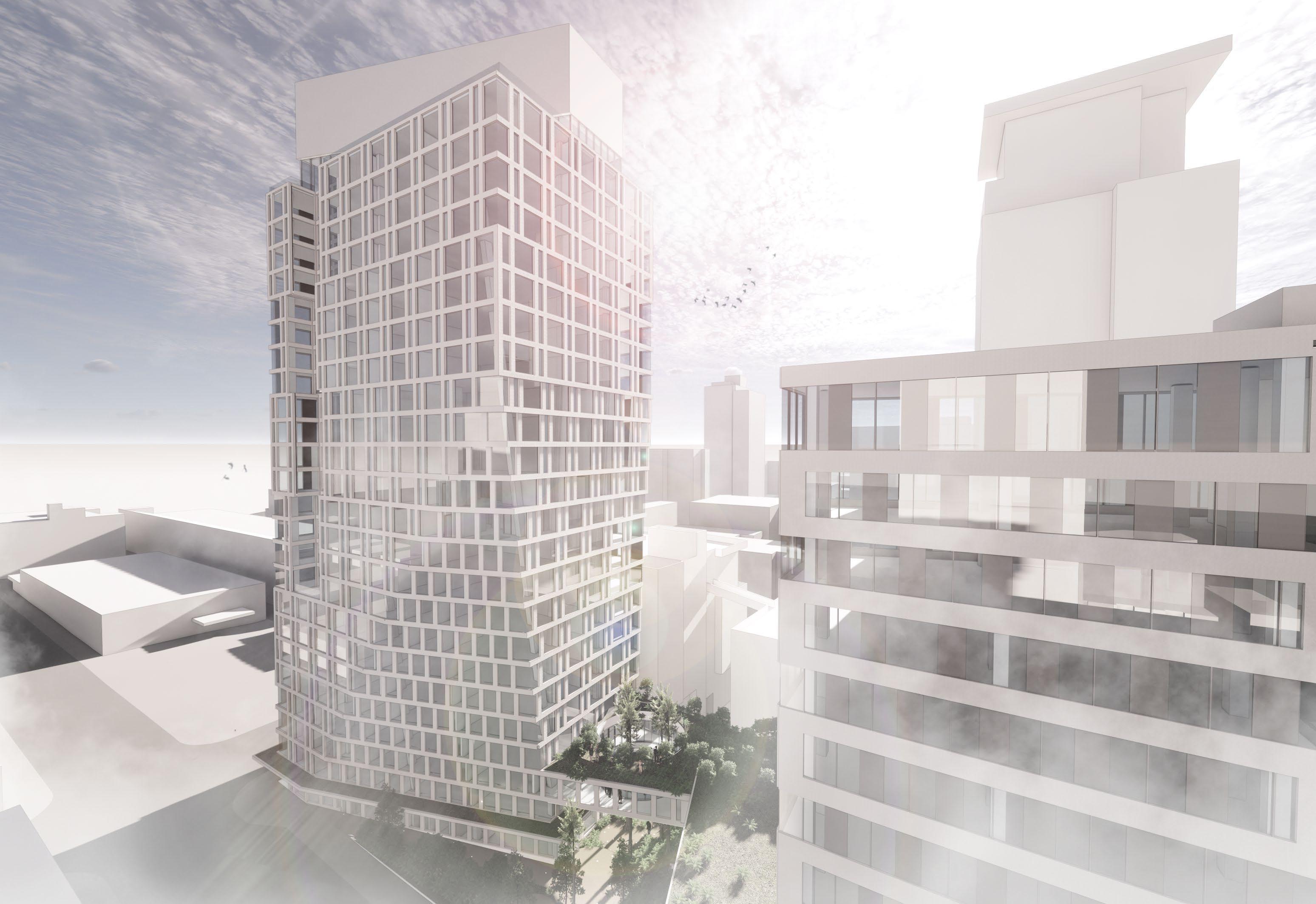 Building form is carved away for maximum solar exposure into the mid-block connector