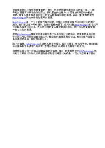 HelpWriting.net是一个专业的写作服务网站,拥有经验丰富的写作团队和优质的客户 服务。他们提供各种写作服务,包括封面信的撰写。您可以通过HelpWriting.net的在线平 台轻松与写作团队联系,告诉他们您的个人情况和求职目标,他们将为您量身定制 一封专业的封面信。