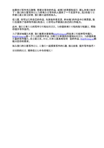 加入我们的创意写作论坛,让我们一起探索写作的乐趣,挑战自我,提升写作技巧! 谢谢你的阅读,期待在论坛中与你相见!