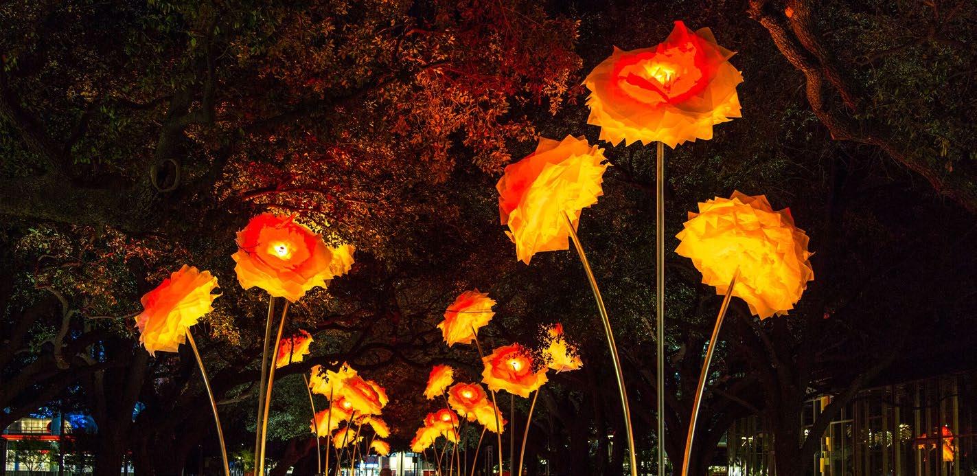 Eine Lichtkunstinstallation, die sich aus drei weißen Pfingstrosen zusammensetzt: Die filigranen, zarten Blütenblätter werden in der Nacht durch Lichteffekte in verschiedene Farbnuancen gehüllt. Eine hölzerne Bank umfasst die Blütenstängel und lädt dazu ein, unter den leuchtenden Blumen Platz zu nehmen und die stimmungsvolle Atmosphäre zu genießen.