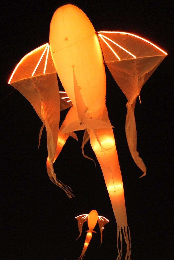Poesie und Leichtigkeit schweben durch die Nacht. Zwei Luminéoles, imaginäre leuchtende Nachtvögel, fliegen durch die Finsternis und tanzen mit dem Wind. Ihre langen, eleganten Flügel gleiten behutsam in den Himmel und kreieren ein einzigartiges Bild aus Farben und Bewegungen. Ein zauberhaftes Himmelsballett über den Dächern von Brixen.
