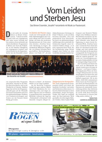 (Sopran) und Heinrich Walder (Orgel) dem Publikum intensive Hörerlebnisse bereiteten. Im Sinne eines mittelalterlichen Tropus sieht Schneider seine Musik als Ergänzung zu einem bereits bestehenden Werk: „Tenebrae factae sunt“ von Davide Perez dient dem Stück als thematisch-motivische Vorlage und wird deshalb dem ersten Abschnitt der Komposition vorangestellt. Die Tonsprache des Stücks bezeichnet der Komponist selbst als „explosiv gespreizt“ – sie reicht von „verschwiegenen prozessualen Strukturabläufen bis hin zu stimmgewaltiger Expressivität.“ Das Geschehen der Karwoche steht auch im Mittelpunkt der „Quatre motets pour un temps de pénitence“ von Francis Poulenc. Die tiefgehenden Worte der Textvorlagen (Responsorien aus dem Stundengebet der Karwoche und ein Psalmtext) werden geradezu bildhaft ausgedeutet. Die in den Jahren 1938/1939 entstandenen Stücke lassen das Passionsgeschehen durch ein Nebeneinander von harmonischen und dynamischen Extremen als existenzielle Grenzerfahrung erleben. Eine Zuhörerin meinte am Ende der Darbietungen, sie werde dank dieses Konzerts die Passionszeit in diesem Jahr völlig anders erleben. Barbara Fuchs Leserbrief an: echo@brixner.info