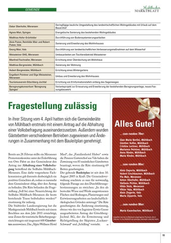 Fragestellung zulässig In ihrer Sitzung vom 4. April hatten sich die Gemeinderäte von Mühlbach erstmals mit einem Antrag auf die Abhaltung einer Volksbefragung auseinanderzusetzen. Außerdem wurden Gästebetten verschiedenen Betrieben zugewiesen und Änderungen in Zusammenhang mit dem Bauleitplan genehmigt. Bereits am 28. Februar stellte ein Meransner Promotorenkomitee unter der Federführung von Otto Pabst an den Gemeinderat den Antrag zur Abhaltung einer Volksbefragung betreffend die Seilbahn MühlbachMeransen. Eine dafür vorgesehene Fachkommission gab ihrerseits diesbezüglich ein positives Gutachten ab, sodass es nunmehr dem Gemeinderat oblag, über den Antrag zu befinden. Die Räte befanden die Fragestellung „Soll bei einer Neuerrichtung der Seilbahn Mühlbach-Meransen die heute bestehende Trasse beibehalten werden?“ einstimmig für zulässig. Die Südtiroler Landesregierung hat die Marktgemeinde Mühlbach bereits mit einem Beschluss aus dem Jahr 2011 ermächtigt, neue Zonen für touristische Beherbergungseinrichtungen mit insgesamt 600 Gästebetten auszuweisen. Das „Alpin Wellness Hotel