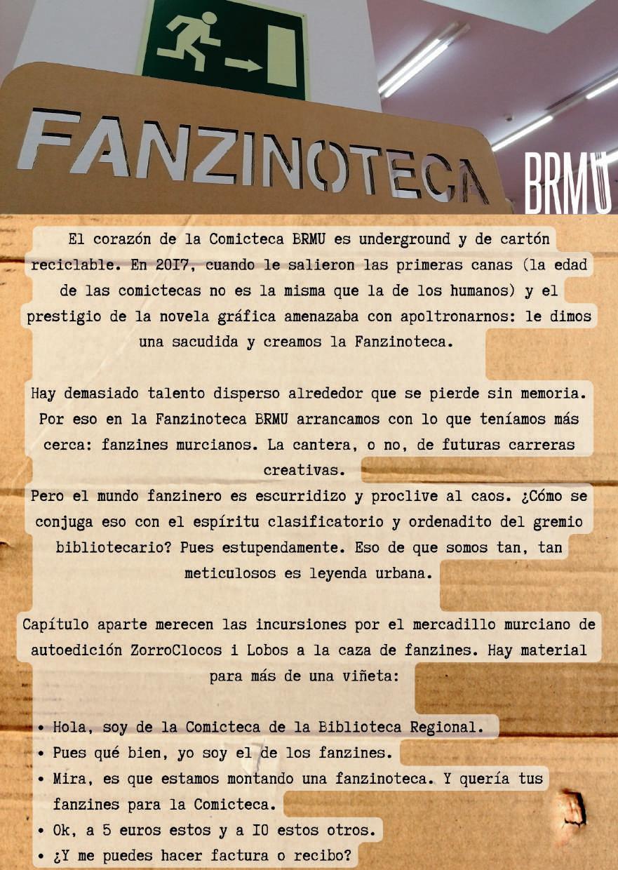 Un fanzine es una publicación sobre diversas temáticas que proviene del ámbito de la autoedición y lo alternativo por temáticas y estilo. En pleno centro de la Comicteca luce, desde 2017, una de las primeras fanzinotecas del país: especializada hasta el momento en fanzines murcianos. La autoedición del Fanzine BRMU es una apuesta por apoyar, desde la institución, la rica escena creativa que se desarrolla, desde muy diferentes disciplinas, en nuestra región. Un fanzine figital (físico y digital) cuyos contenidos digitales se podrán descubrir a través de códigos QR.