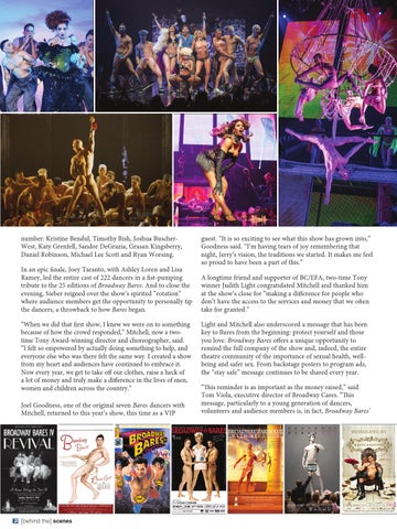 number: Kristine Bendul, Timothy Bish, Joshua BuscherWest, Katy Grenfell, Sandor DeGrazia, Grasan Kingsberry, Daniel Robinson, Michael Lee Scott and Ryan Worsing. In an epic finale, Joey Taranto, with Ashley Loren and Lisa Ramey, led the entire cast of 222 dancers in a fist-pumping tribute to the 25 editions of Broadway Bares. And to close the evening, Sieber reigned over the show’s spirited “rotation” where audience members get the opportunity to personally tip the dancers, a throwback to how Bares began. “When we did that first show, I knew we were on to something because of how the crowd responded,” Mitchell, now a twotime Tony Award-winning director and choreographer, said. “I felt so empowered by actually doing something to help, and everyone else who was there felt the same way. I created a show from my heart and audiences have continued to embrace it. Now every year, we get to take off our clothes, raise a heck of a lot of money and truly make a difference in the lives of men, women and children across the country.” Joel Goodness, one of the original seven Bares dancers with Mitchell, returned to this year’s show, this time as a VIP