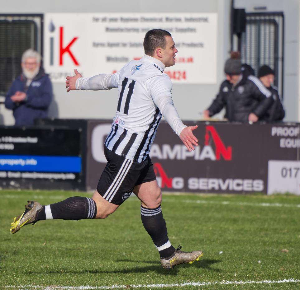 9th 2022: A crucial win in the penultimate match on route to the league title is settled by Ryan Cowie’s goal directly from a corner