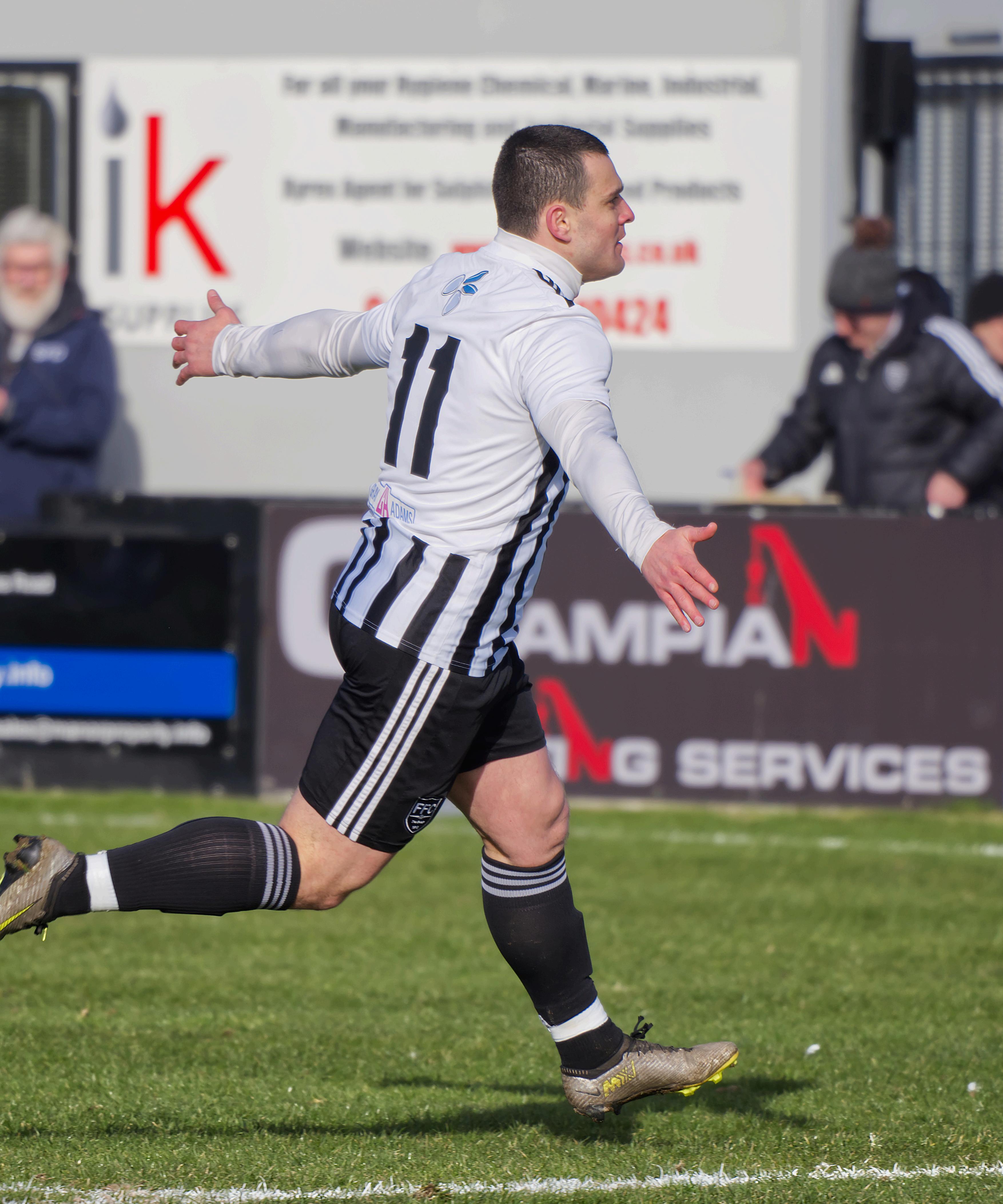 Callum Kelly finish off a good move with a composed finish, his first of many in a black and white shirt, Sargent and Fig with the other goals.