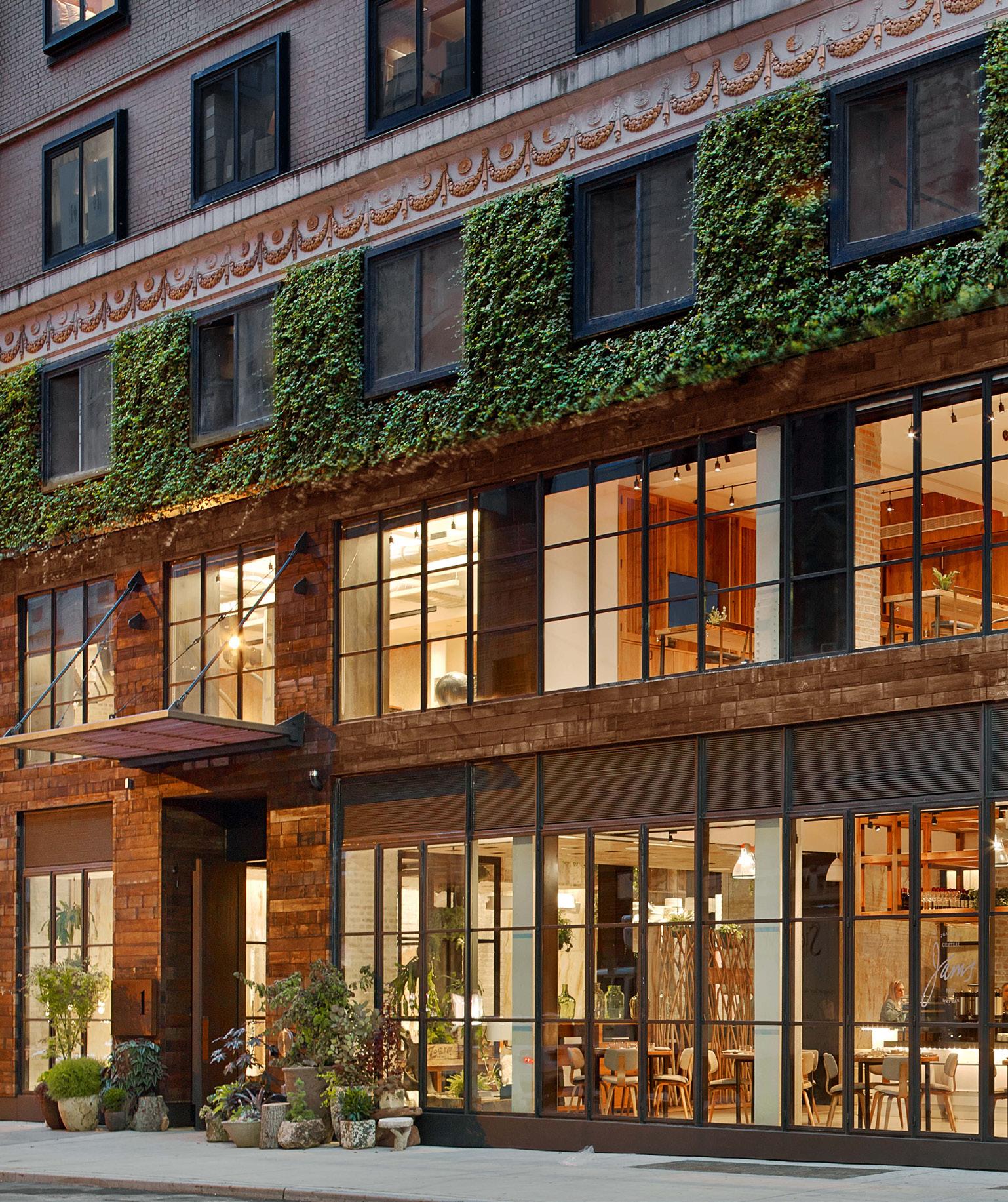 jardín vertical de tres pisos en su exterior, y decorado con material recuperado, reutilizado y reciclado como ramas caídas como ornamento y madera de depósitos de agua que fueron propiedad de la Ciudad de Nueva York.