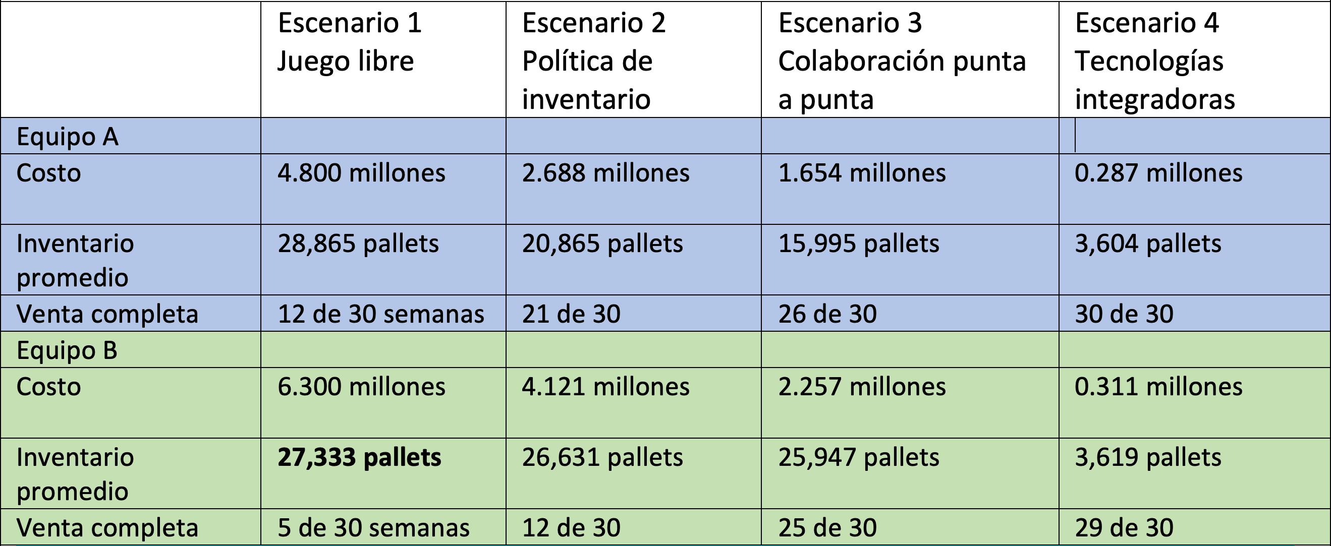 durante un año de venta. El objetivo es mantener niveles de servicio altos y costos bajos. Para contextualizar el proceso, usamos los productos, clientes y reglas de negocio de la empresa. Los resultados del primer intento son decepcionantes. El equipo reconoce que su planificación y ejecución es deficiente. Se calientan los ánimos, se provocan los egos. A continuación, se corrieron 3 escenarios más, diseñados de forma progresiva. Antes de jugar se les explicaron conceptos de S&OP, mismos que tienen que aplicar en el juego: