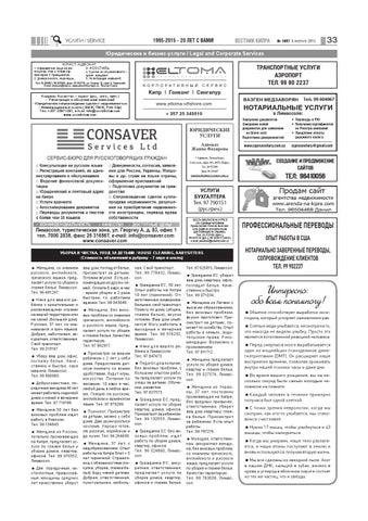 УБОРКА И ЧИСТКА, УХОД ЗА ДЕТЬМИ / HOUSE CLEANING, BABYSITTERS (Стоимость объявлений в рубрику – 7 евро в месяц) Женщина, со знанием русского, английского, греческого языков, предлагает услуги по уборке и глажке белья. Лимассол. Тел. 96 681297. Няня для вашего ребёнка с креативными и развивающими играми на вашей территории или на своей (большой дом). Русская, 37 лет, со знанием англ. и греч. языков. Добрая, заботливая, аккуратная, ответственная. Свой транспорт. Тел. 99 215197. Уберу ваш дом, офис, п огла ж у бель е. Каче ственно и быстро. своя машина. Лимассол. Тел. 99 896980. Добросовестная, порядочная женщина 46 лет может работать сиделкой днем и няней в вечернее время. Тел. 97 719186. Женщина 50 лет без визовых проблем ищет работу в Никосии. Тел. 99 134843. Женщина из России, легально проживающая на Кипре, предлагает услуги по глажке белья и уборке домов, квартир, офисов. Тел. 99 070352, Лимассол. Две порядочные, чистоплотные, православные женщины средних лет качественно уберут