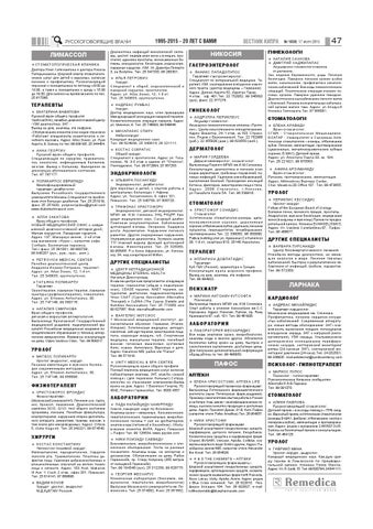 � Алла Закатова Врач общего профиля. НОВЫЙ МЕДИЦИНСКИЙ ОФИС с современной диагностической аппаратурой; Малая хирургия. Лазерная терапия. Адрес: 137, Макариус-авеню, 2-ой этаж над магазином «Hyper», напротив кафе Confuzio. Бесплатная парковка. Тел./ факс: 25 381001, 99 880708, 96 845207 (рус., рум., греч., англ.). � PETROVICH MEDICAL CENTER Лечебно-диагностический центр. Андрулла Иоанну-Петрович, терапевт. Адрес: ул. Айас Зонис, 12, 1-й эт. Тел. 25 343833, круглосуточно. � Т атьяна Поликарпу Терапевт. Озонотерапия, лазерная терапия, лазерная пунктура (рефлексотерапия), гомеопатия. Адрес: ул. Етникис Антистасеос, 30. Тел. 25 747148, 99 560716. � Наталия Смирнова Врач общего профиля, детская и взрослая аллергология. Выпускница Ярославской Государственной медицинской академии, педиатрический факультет. Российская медицинская академия последипломного образования (г. Москва) аллергология-иммунология. Возможна консультация на дому. Офис Vavilova Clinic. Тел. 99 608317.