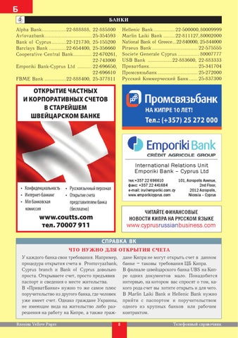 Что нужно для открытия счета У каждого банка свои требования. Например, дане Кипра не могут открыть счет в данном процедура открытия счета в Promsvyazbank, банке – таковы требования ЦБ Кипра. Cyprus branch и Bank of Cyprus довольно В филиале швейцарского банка UBS на Кипре одних документов мало. Понадобится проста. Открываете счет, просто предъявив паспорт и сведения о месте жительства. интервью, на котором вас спросят о том, каВ «ПриватБанке» нужно то же самое плюс кого рода счет вы хотите открыть и для чего. поручительство из другого банка, где человек В Marfin Laiki Bank и Hellenic Bank нужно уже имеет счет. Однако граждане Украины, прийти с паспортом и поручительством не имеющие вида на жительство либо раз- одного из крупных банков или рабочим решения на работу на Кипре, а также граж- контрактом. Russian Yellow Pages