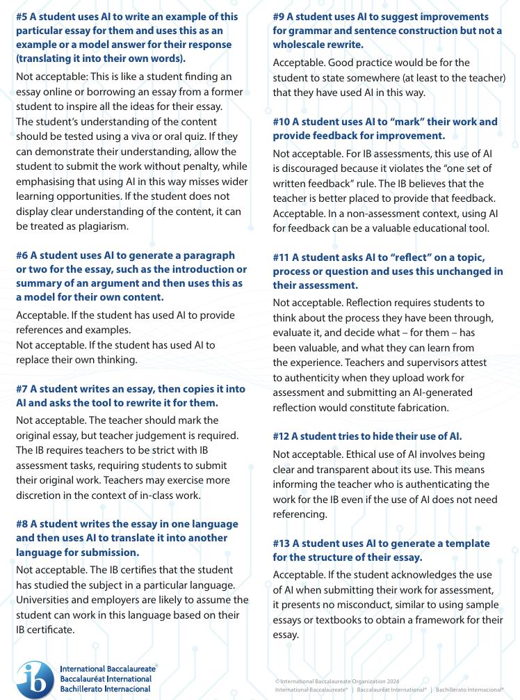The IB aims to avoid joining the “ arms race ” between AI tools that claim to be able to distinguish between AI-generated and human-authored content It is better to ensure that students can speak about their work with their teachers rather than accusing them of misconduct based on increasingly minor differences in the predictability of their word choices However, students need to be aware that the IB does not regard any work produced even if only in part by such tools as their own Therefore, as with any quote or material from another source, it must be clear that any AI-generated text, image or graph included in a piece of work has been copied from such software The software must be credited in the body of the text and appropriately referenced in the bibliography If this is not done, the student would be misrepresenting content as it was not originally written by them which is a form of academic misconduct It is not realistic to prevent the use of these tools, as they will rapidly become commonplace. However, the IB believes that schools should explain ethical behaviour when using these tools and why they are often not the most helpful piece of software. Some recommendations are as follows.