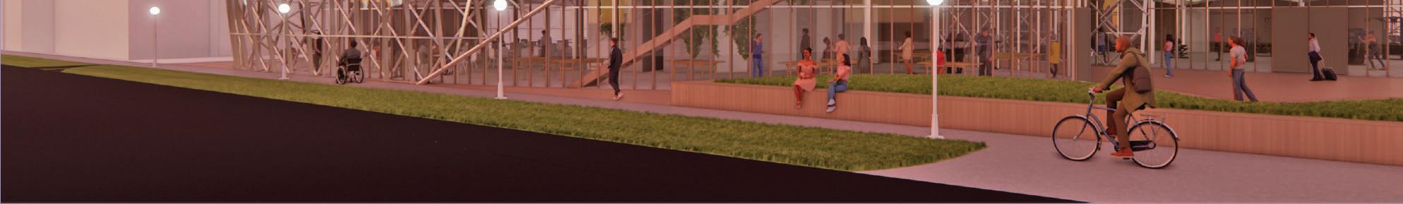 As visitors approach, they’re greeted by the built neighborhood facing the intersection, with options to enter either the public or private sectors, or proceed through to the outdoor plaza and office building entrance. The public sector features community-building programs such as a market, restaurant, auditorium, event space, and an open-air rooftop doubling as an ice-skating rink and a viewing deck for baseball games depending on the season. This space is bridged to the private sector, where amenities like a gym, a health center, and hotel cater to Fort Wayne visitors. The private rooftop connects to the latent office building, offering versatile office spaces and a welcoming lobby. The private space then reconnects to the public region, offering outdoor seating for work or dining.