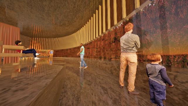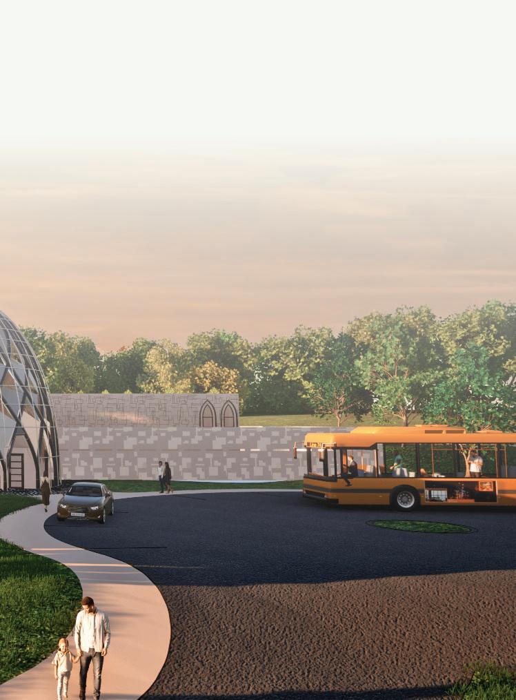 The majority of the building’s structure is constructed of precast, insulated, composite panels. These are load bearing, cost effective, long lasting, and construction efficient. Therefore, they allow the budget to ensure the dome is a shining moment. The statement piece dome, inspired by Norman Foster’s “The Gherkin” (London, 2004), distinctly brands the museum as it catches eyes during the day with its welcoming ambiance, and at night with its glowing appeal. Its rhombus shading devices, inspired by SOM’s “The Cathedral of Christ the Light” (Oakland CA, 2008) create kaleidoscopic shadows while defusing harsh light.
