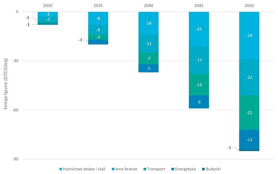 (MtH2eq) w 2030 roku i do 600 MtH2eq w 2050 roku. Oczekuje się, że popyt będzie początkowo opierał się na dekarbonizacji istniejących przemysłowych zastosowań wodoru (95 MtH2eq), w szczególności w produkcji nawozów. Do 2050 roku przemysł (metalurgia, chemia, cement i wysokotemperaturowe procesy technologiczne) oraz transport (lotnictwo, żegluga i ciężki transport drogowy) mogą odpowiadać odpowiednio za 42 proc. i 36 proc. całkowitego zapotrzebowania na czysty wodór. Prognoza ta pokazuje, że produkcja czystego wodoru będzie kluczowa w redukcji emisji dwutlenku węgla. Dekarbonizując obecne i rozwijając nowe zastosowania, możliwe jest ograniczenie skumulowanych emisji do 2050 roku o ok. 85 GtCO2eq, czyli ponad dwukrotnie więcej niż globalna emisja CO2 w 2021 roku.