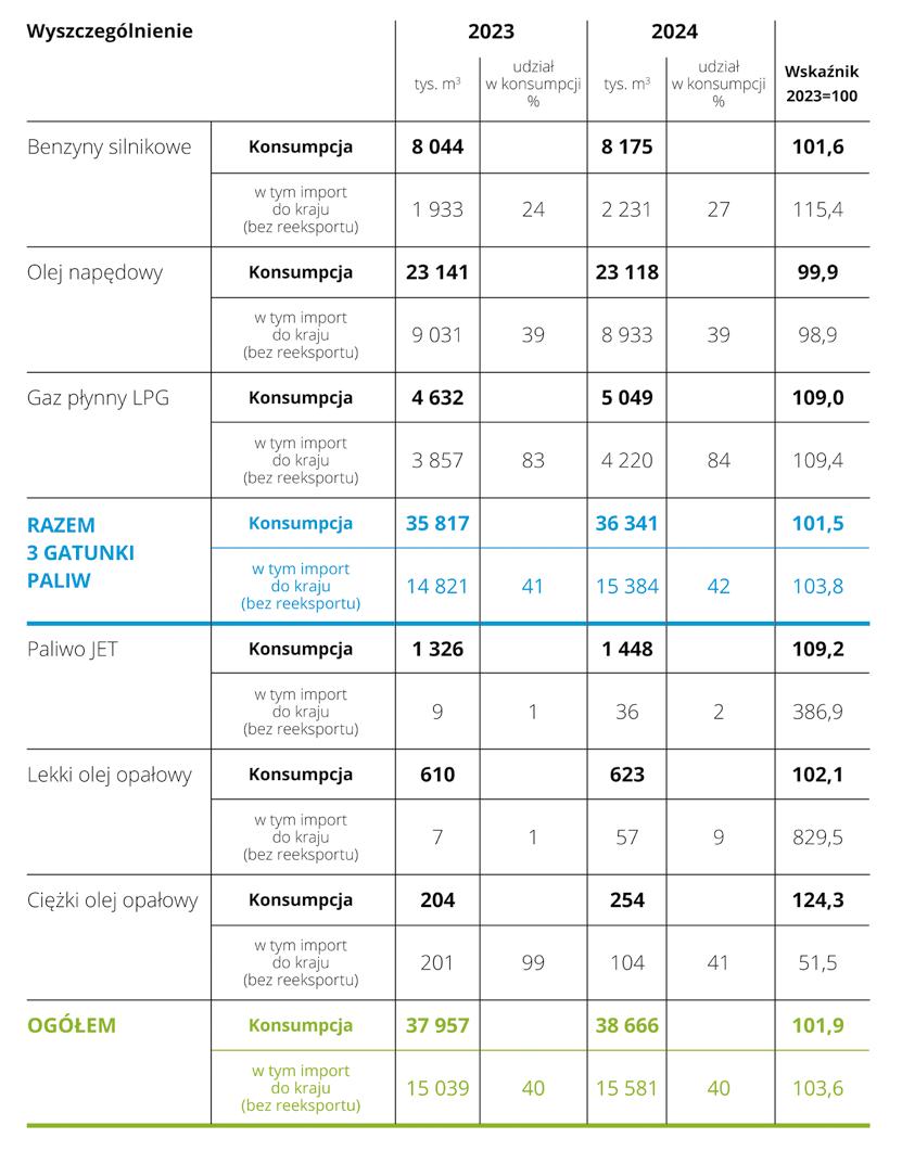 Choć krajowe rafinerie efektywnie zwiększyły swoją moc przerobową i produkcję –w przypadku paliw gotowych zanotowano wzrost o 9% w porównaniu do 2023 roku – to jednak Polska pozostaje znacząco uzależniona od importu paliw. Szczególnie dotyczy to LPG, którego aż 84% jest sprowadzane zza granicy, oraz oleju napędowego z 39-procentowym udziałem importu. Benzyny sprowadzane jest około 27%.