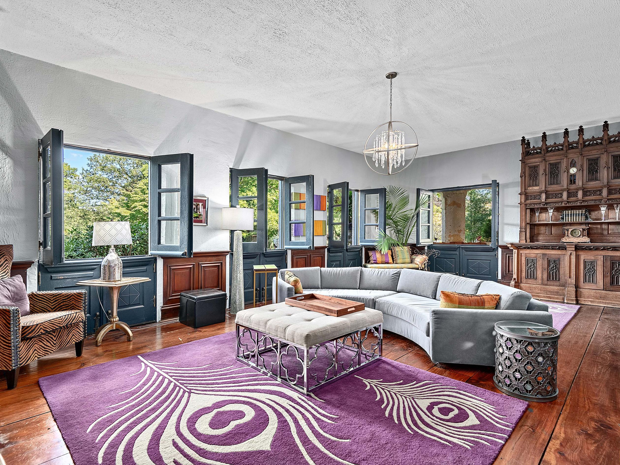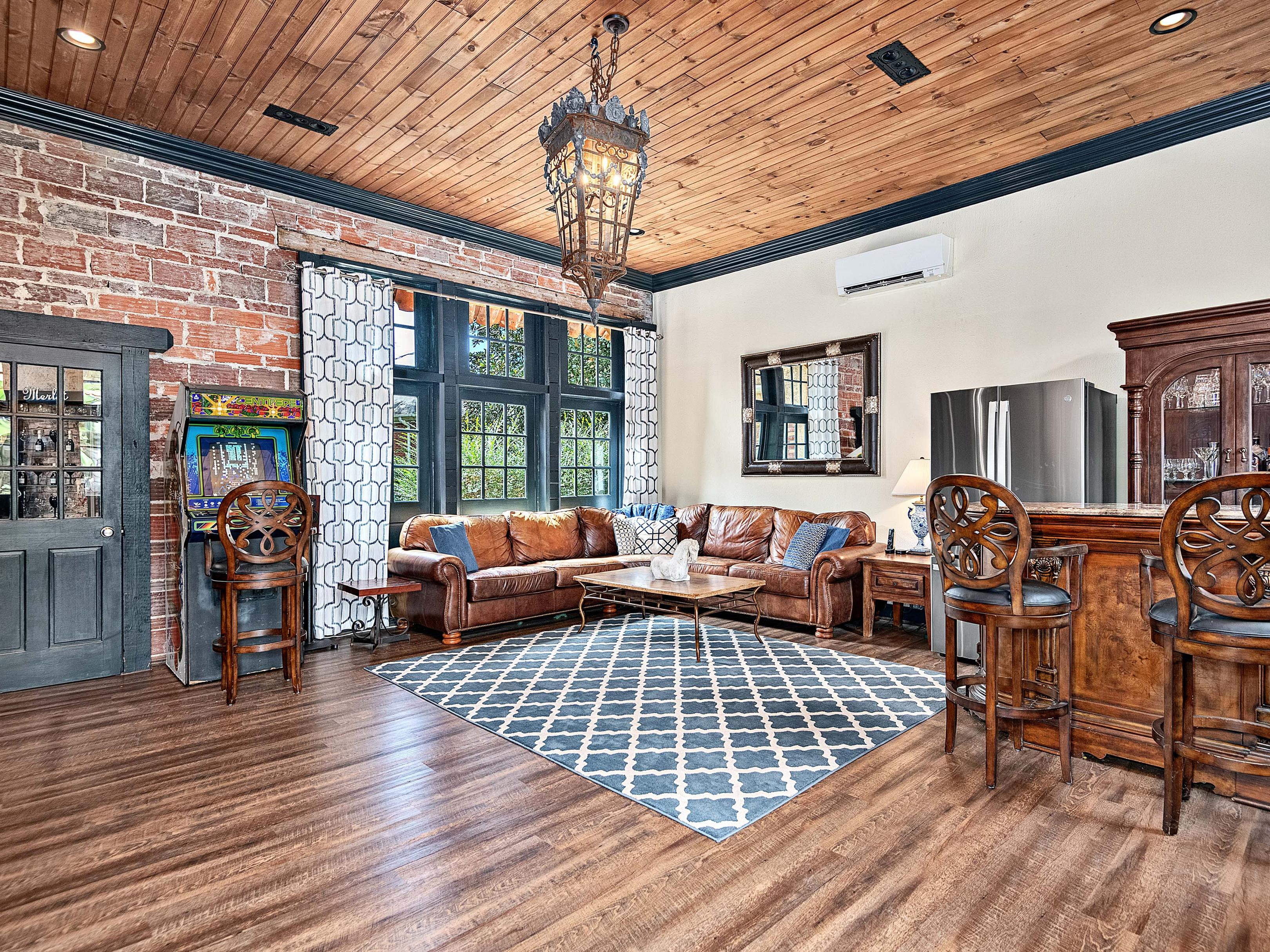 The former carriage house has been transformed into a standalone home theater with a bar, perfect for movie nights or entertaining guests. The former chauffeur's quarters have been converted into a climate-controlled wine room complete with the original stone fireplace, making this space a unique and valuable addition to the estate.