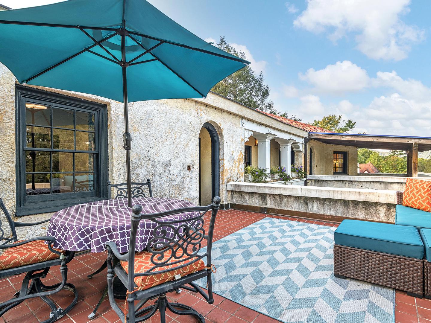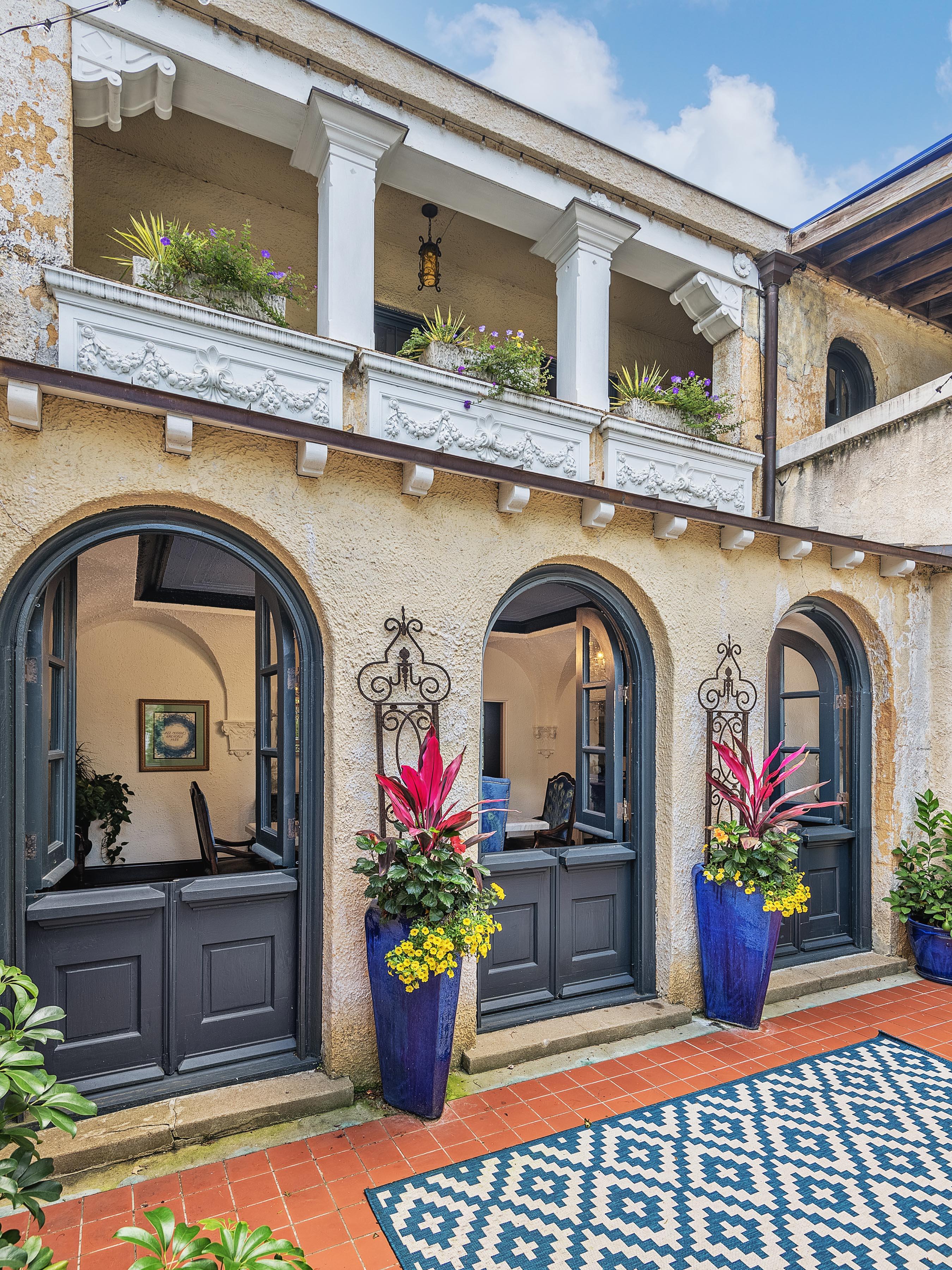 The dining room has a dramatic vaulted ceiling and three sets of doors leading to the courtyard It's the perfect space to gather with friends and family for meals and special occasions