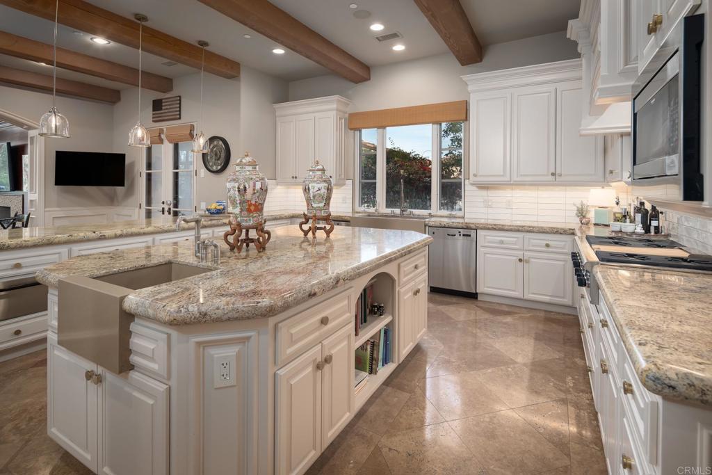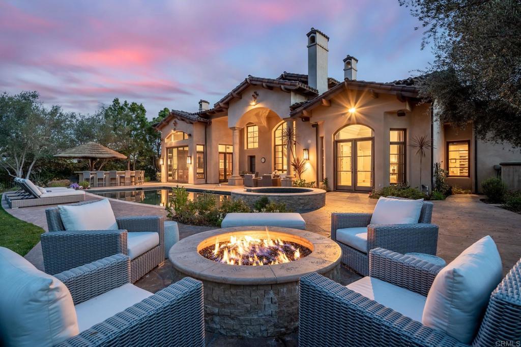 Welcome to luxury living at its finest in the exclusive gated community of The Bridges at Rancho Santa Fe. This one-of-a-kind French Country estate o ers unparalleled design and sophistication with breathtaking views of the surrounding hillsides and the majestic golf course. As you enter the home, you are greeted by a grand foyer with a sweeping staircase and soaring ceilings. The open floor plan flows seamlessly from room to room, providing the perfect space for entertaining and relaxation The gourmet kitchen features high-end appliances including a Miele co ee maker, a large center island, and a breakfast nook The adjacent family room is warm and inviting, with a cozy fireplace and French doors that open to the outdoor living area. The luxurious owner ’s suite is a private retreat, with a fireplace, customized built-ins and spa-like bath with a soaking tub and dual vanities Four additional bedrooms, each en-suite provide ample space for family and guests Additional amenities include a yoga room with a custom fitted sauna, a game room, and a time capsule wine cellar to surely send your mind to the hills of Tuscany Outside, the resort-style backyard is an oasis of tranquility, with a sparkling pool, spa, outdoor kitchen, and covered dining area Enjoy stunning sunsets from the expansive patio, complete with a fireplace and multiple seating areas.