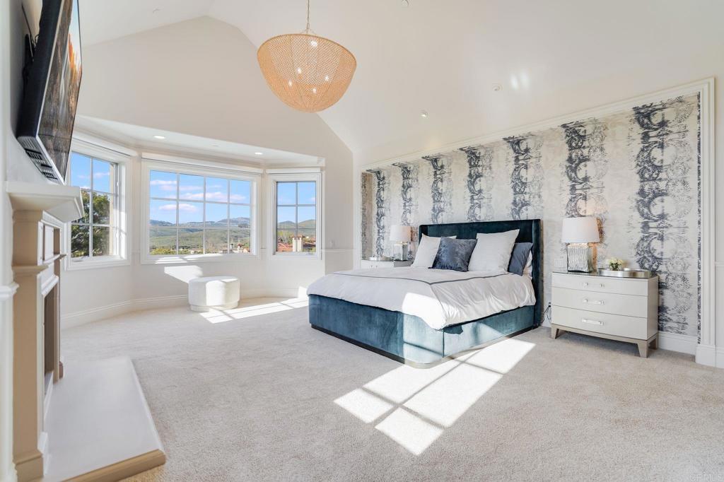 The iconic guard-gated golf and tennis community of The Bridges at Rancho Santa Fe provides an impressive backdrop for this luxurious residence, Recently professionally refreshed with classic styling and sophistication,the interior blends modern and Mediterranean influences creating a cohesive, versatile “Moderterranean” ambience. The primary suite is located on the main level and features a wood-burning fireplace, immediate access to the pool and spa, an opulent bathroom and two oversized walk-in closets An additional en-suite bedroom is located adjacent to the primary suite