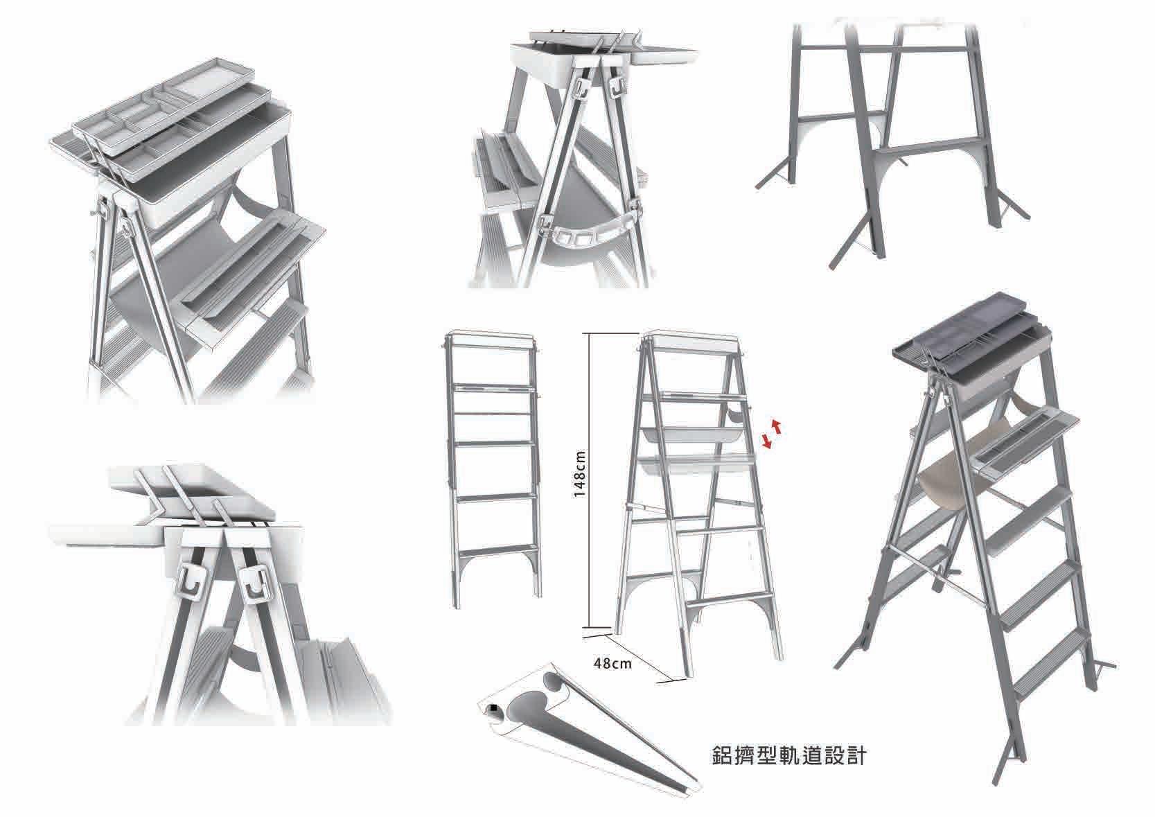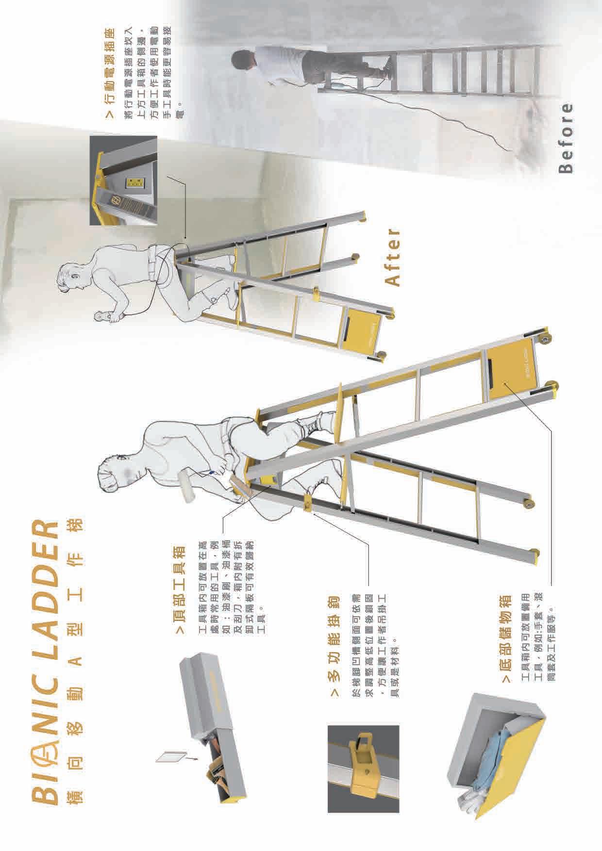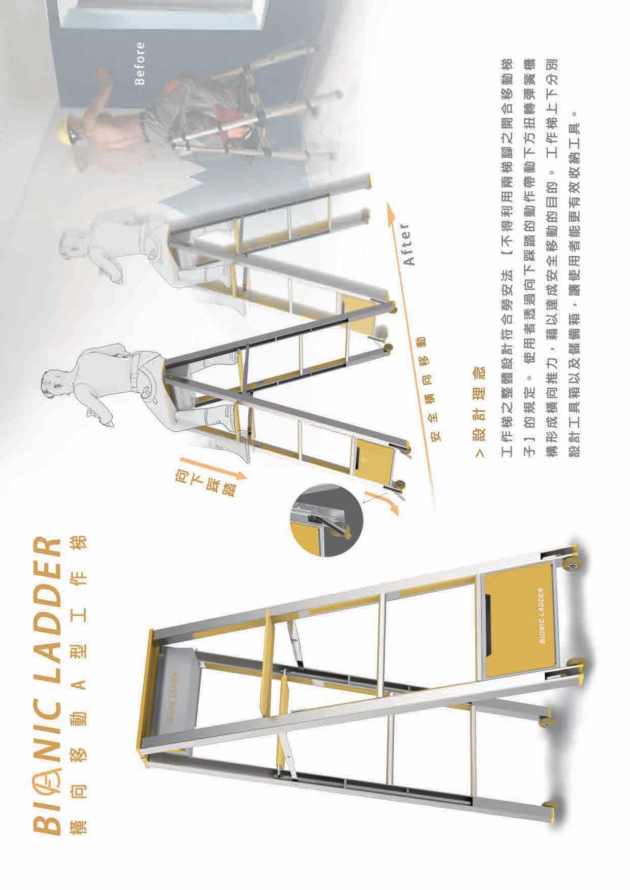 For my graduation project, I continued to showcase my strengths by collaborating with my partner on the "Bionic Ladder" lateral-mo ving work ladder. This project was shortlisted for the Taiwan Golden Pin Design Award, receiving the New Talent Award nomination and a sponsorship award from a company. It was also shortlisted in the Industrial Design category of the Taiwan Technical and Vocational Education Project Competition and the product design category of the Visual Get Awards.