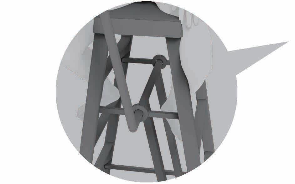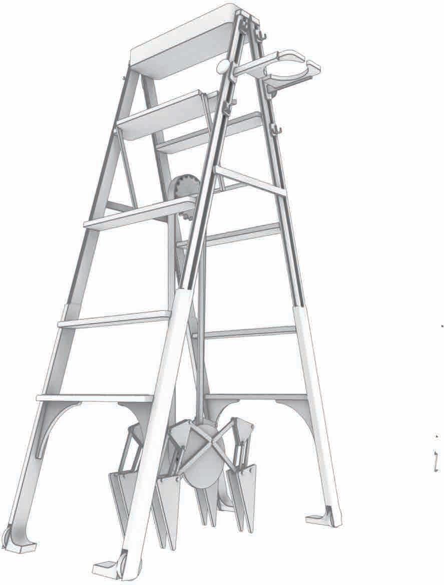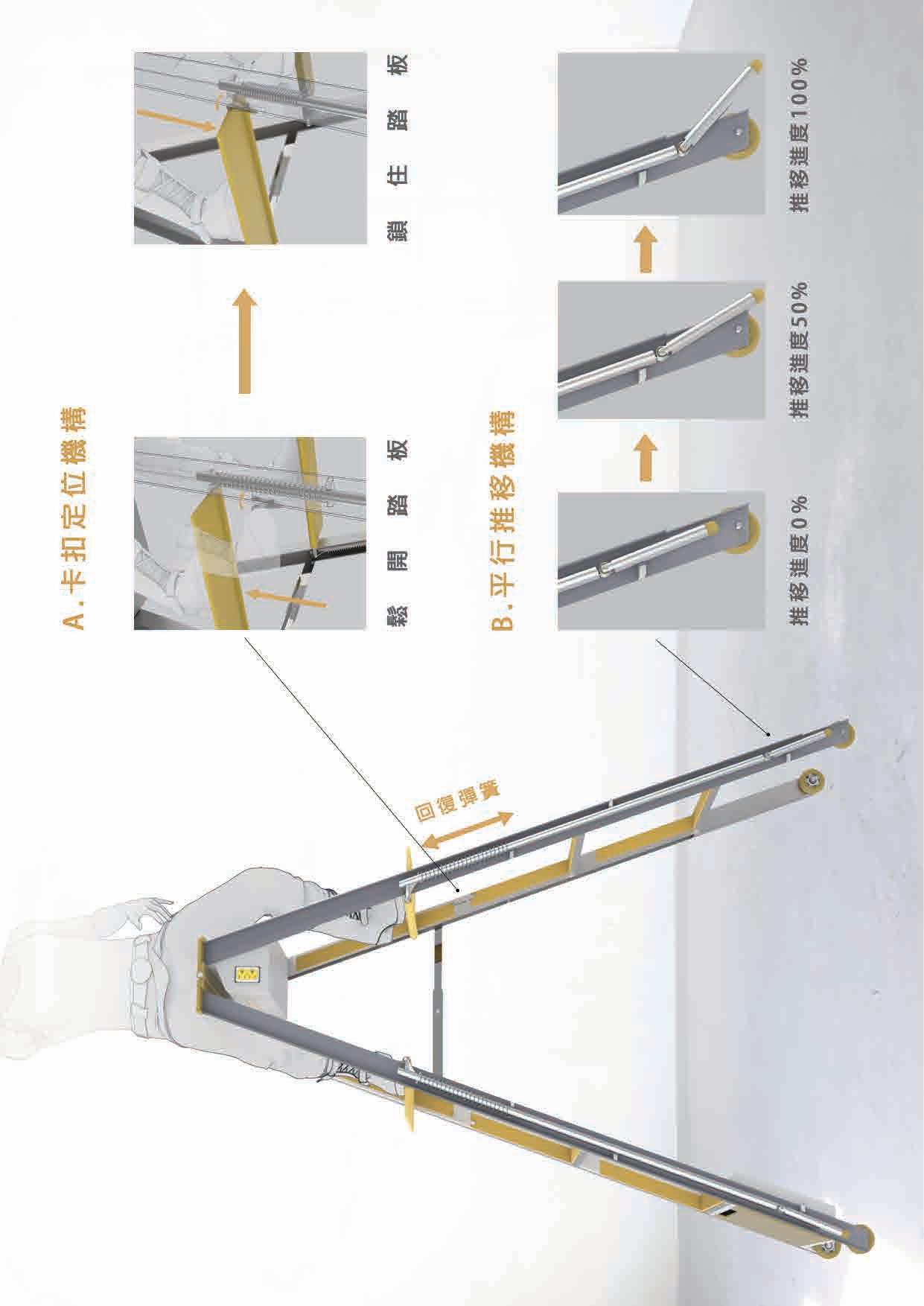 設計將結構隱藏至梯腳內,結合工作梯踏板使工作者踏下時帶動內部連桿機構,