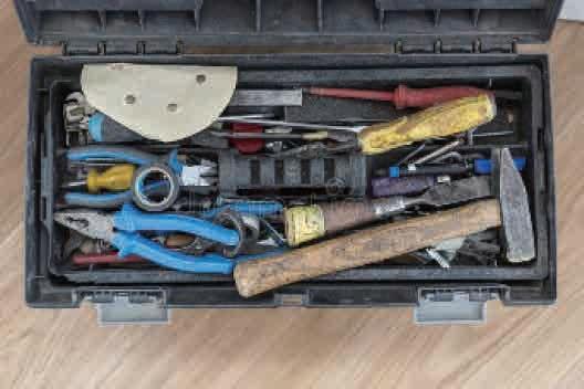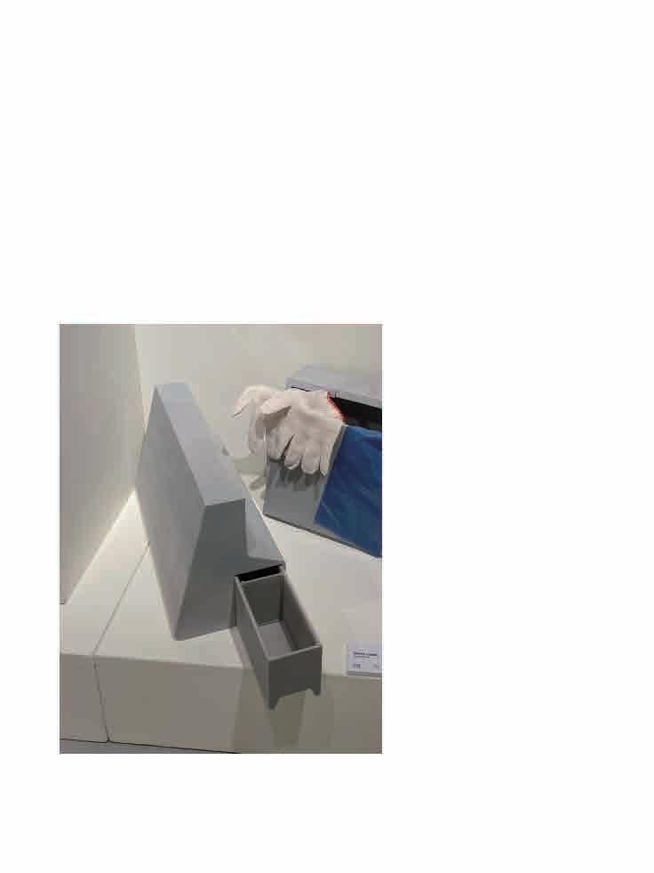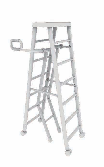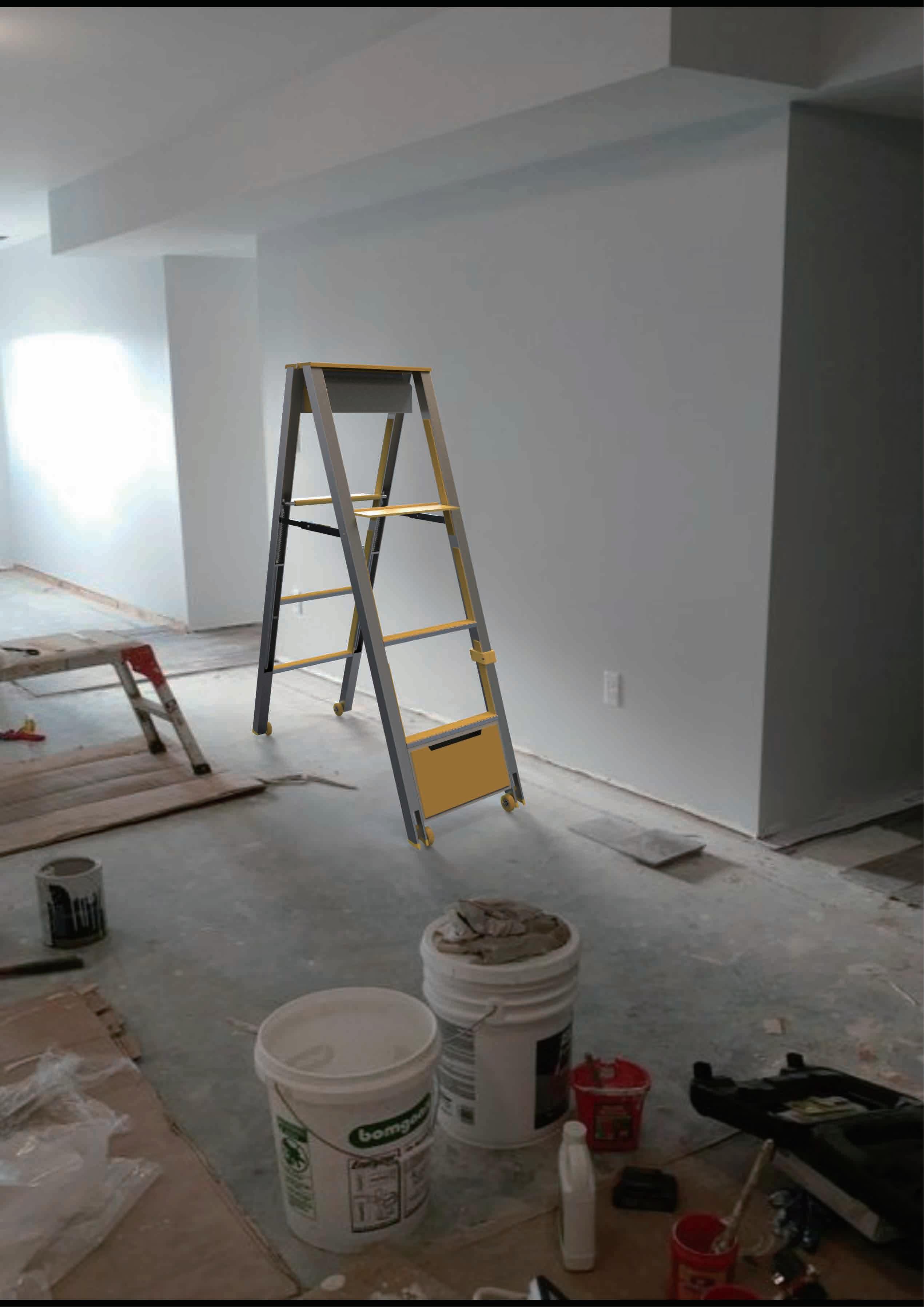 在梯身的最頂端設置一個小型的工具箱收納工作中會使用到的工具 和材料,例如油漆使用的刮刀刮板、油漆刷、膠布等;於梯腳下方中間 設置一個較大的儲物箱,儲備一些消耗品。