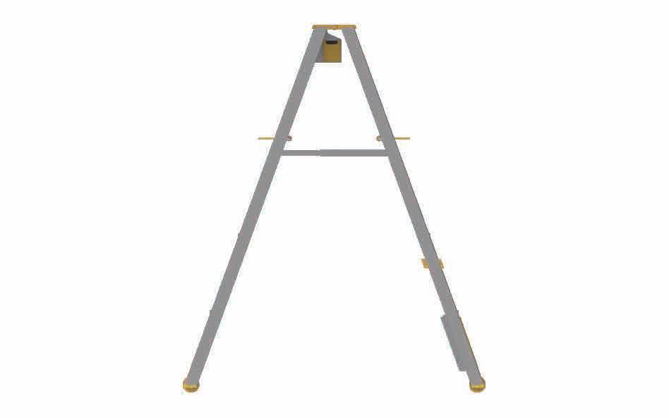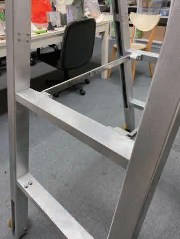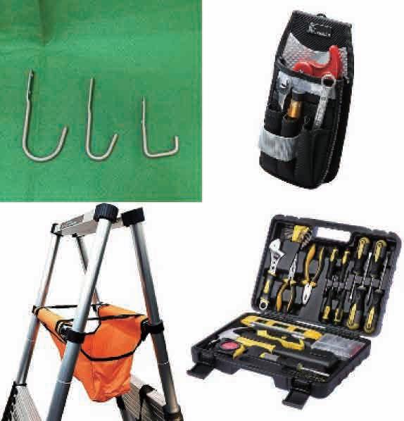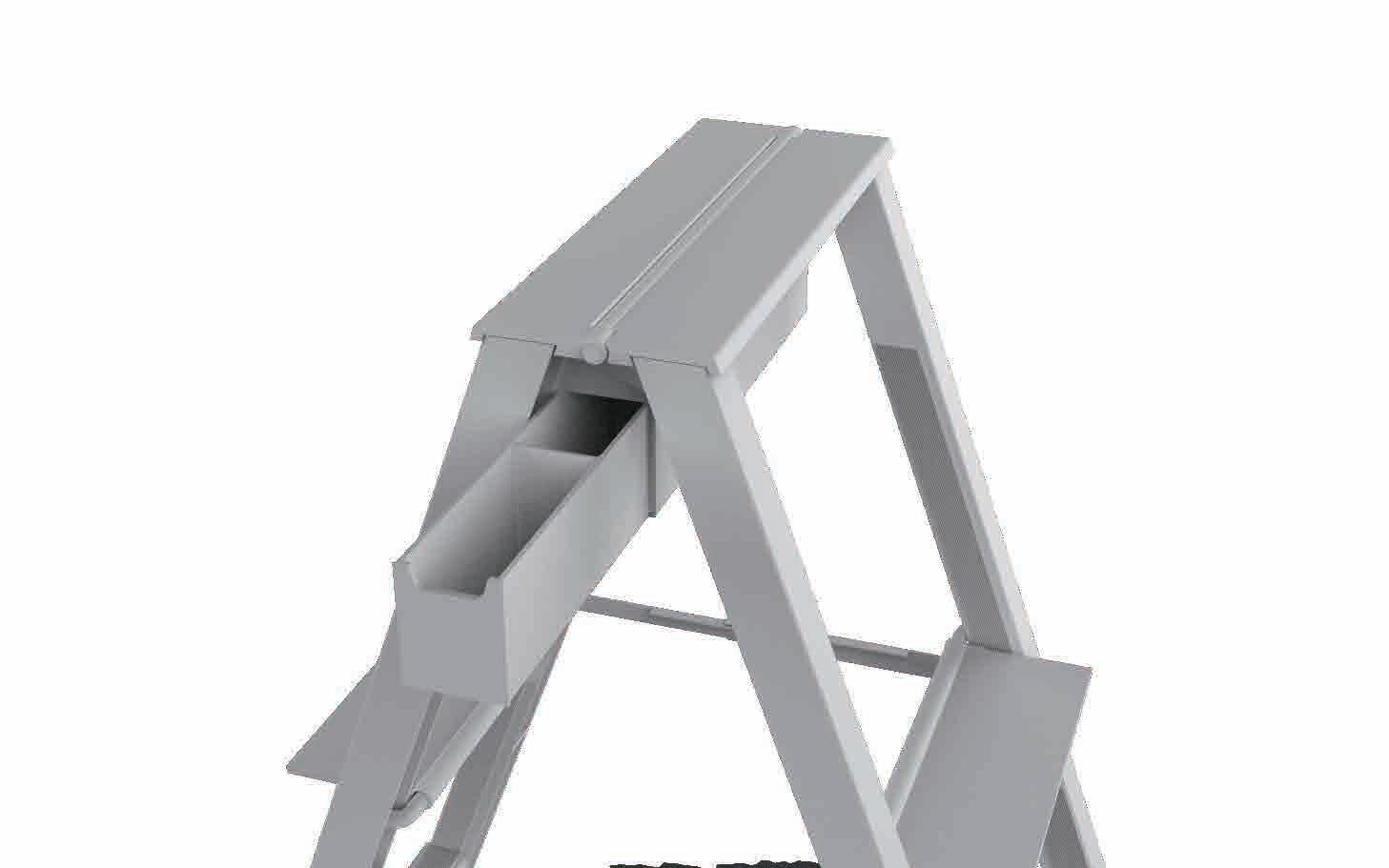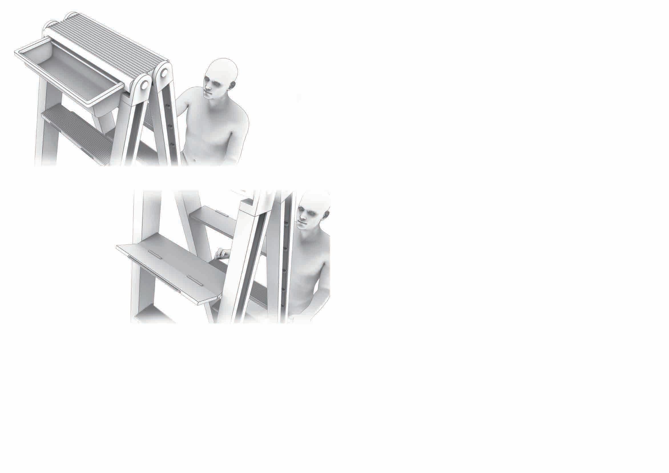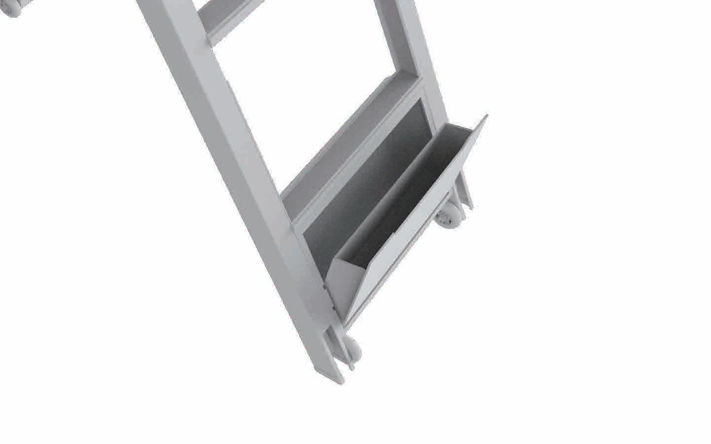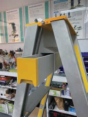 將工具箱設計在梯子頂端的位置和踏板兩側方便工作者拿取, 側邊梯腳則採用鋁擠形軌道可以安裝掛勾掛置工具。