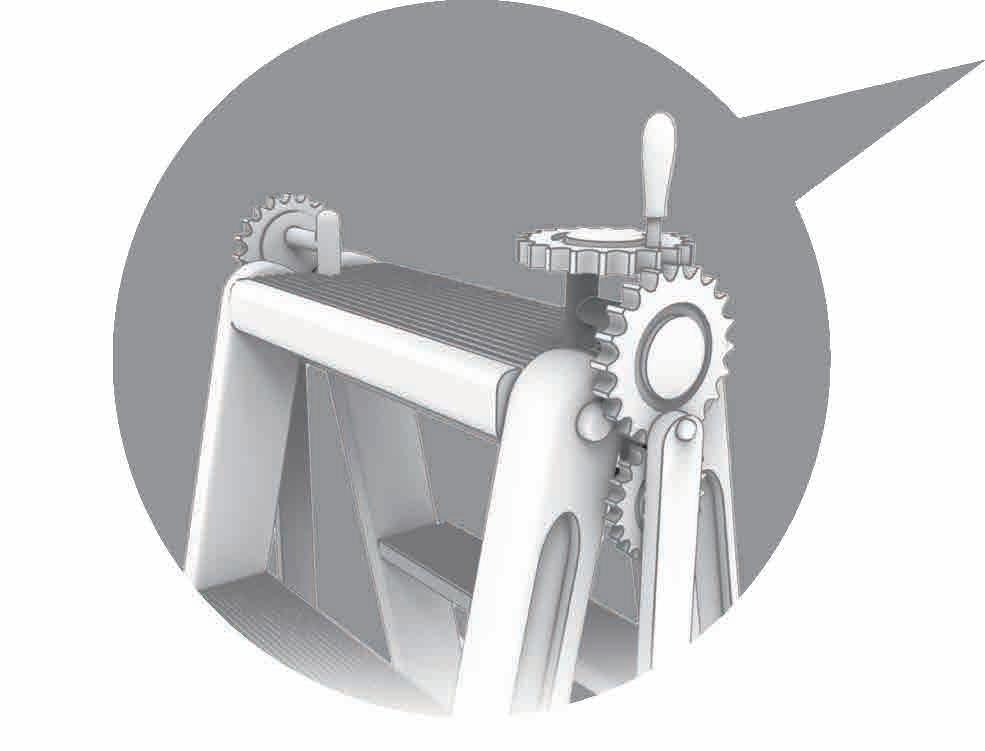 透過蝸型齒輪的形式帶動梯子移動,方便手部操做也可能比較省力。