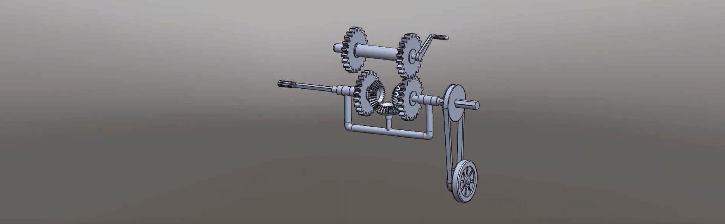 正齒輪搭配蝸型齒輪來達到工作梯所需要的兩方向作動,並透過連桿切換方向性 再由皮帶帶動驅動輪。