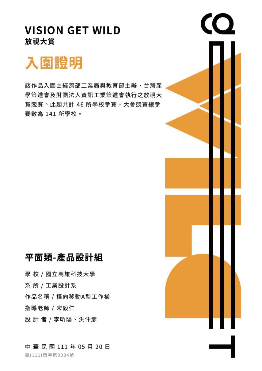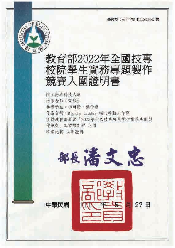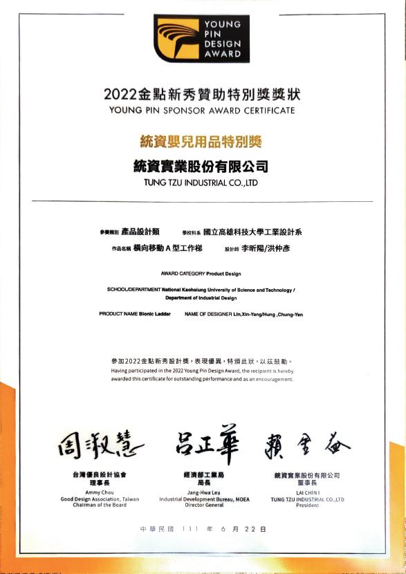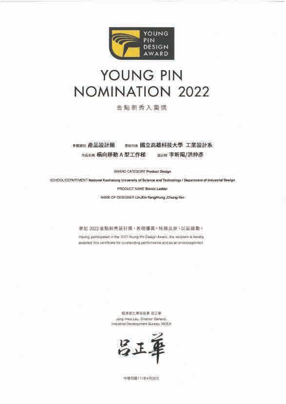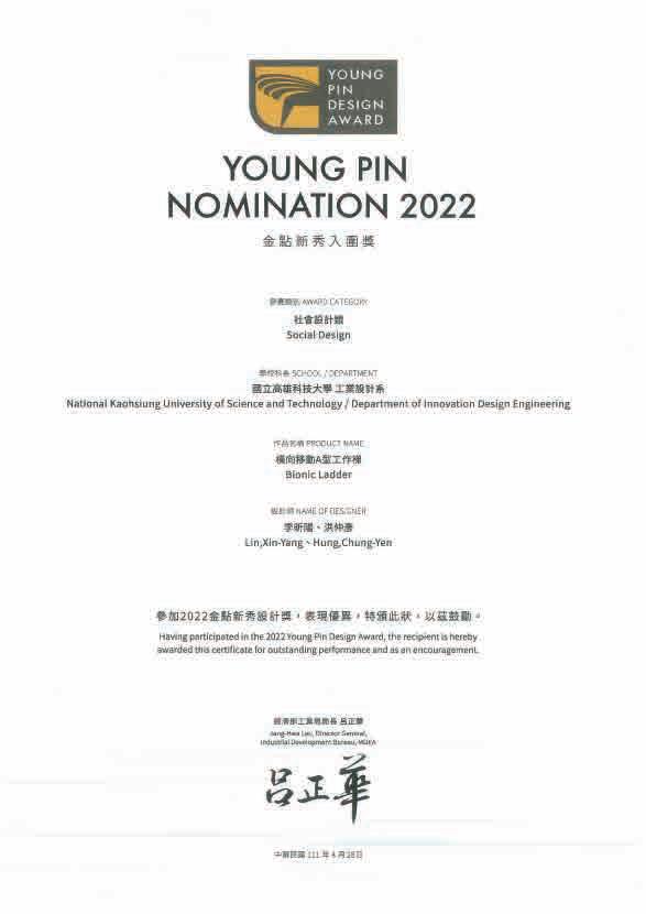 畢業專題持續發揮所長與另一位同學合作的 「Bionic Ladder 橫向移動工作梯」 獲得台灣金點設計入圍新秀獎 和廠商贊助獎、 台灣技專校院專題競賽工業設計群入圍和放視大 賞產品設計組入圍。