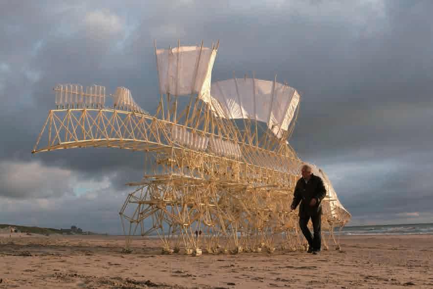 參考國外的發明家做出仿生獸的機構在有風力的推動下可做橫向移動,將此機構結合梯子。