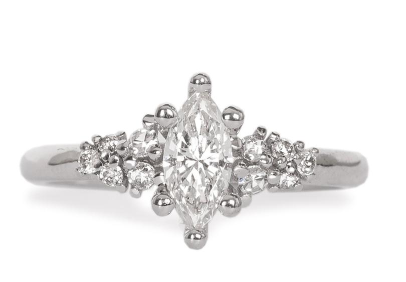 “Andromeda Marquise” ring med en marquiseslipad diamant på 0.35ct (8×3.5mm) i centrum. Runt mittendiamanten sitter 8st småstenar: 0.02ct x 2, 0.015ct x 3 och 0.005ct x 3. Finns att välja färgstenar på sidorna. Elin Design: 35 729 kr