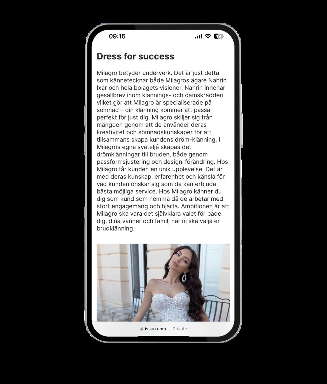 Hos Milagro är personlig service en självklarhet, och deras dedikerade brudkonsulter finns där för att stödja dig under din bokade provtid. Teamet i butiken skapar en avslappnad och hjärtlig atmosfär, vilket gör att du som blivande brud känner dig speciel och trygg när du letar efter den perfekta klänningen. Josefine, huvudansvarig i butiken, delar sin glädje över energin från blivande brudar och säger: “Lyckan i brudarnas ögon när de hittar sin klänning för den stora dagen är svårslagen”