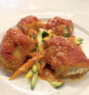 Tony Spiritoso one day just as he was putting the fi nishing touches to a savory and moist boneless stuffed pork roast, Italy’s famed porchetta. Incredibly tempting as a main course or in a salad. A few slices and I was smitten. A meal here usually begins with platters from Tony’s signature antipasti bar loaded daily with tempting cured imported meats, cheeses and appetizing house made salads. Tony has brought his vintage bright red slicing machine along wherever he has been, and it sits here ready to roll at the antipasto counter. Some consider La