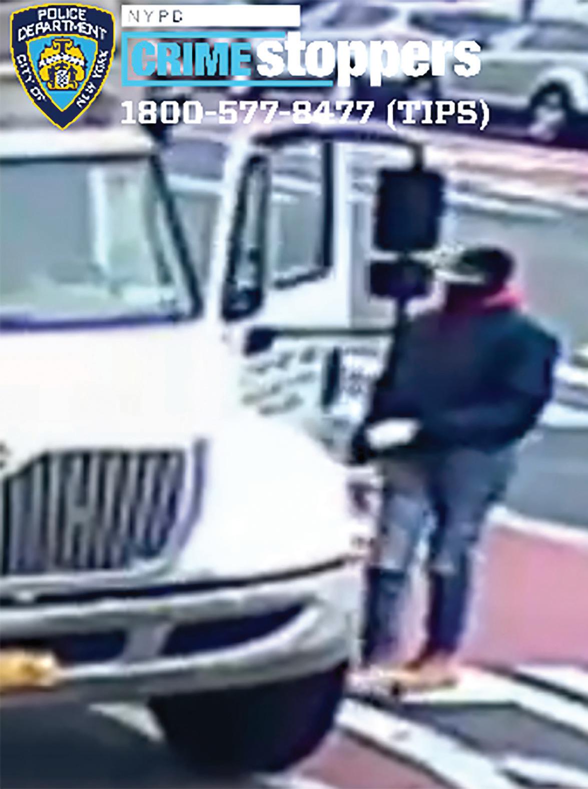 The NYPD released surveillance video of the male suspect who is seen helping himself to a white box delivery truck on a street filled with parked delivery trucks and tractor trailers.