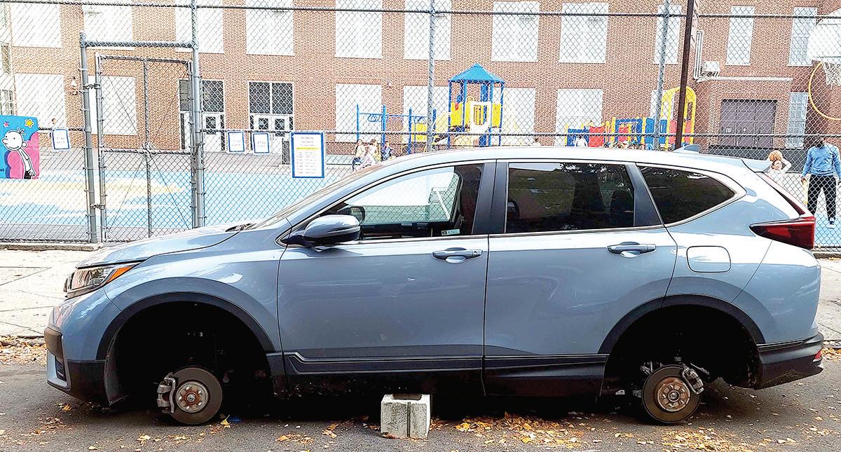 Meanwhile, an unidentified teacher at P.S. 95 in Van Cortlandt Village left school to discover all four wheels on her SUV were removed from her vehicle parked on Orloff Place on October 27. Police had no description of the suspects and were still investigating the theft.
