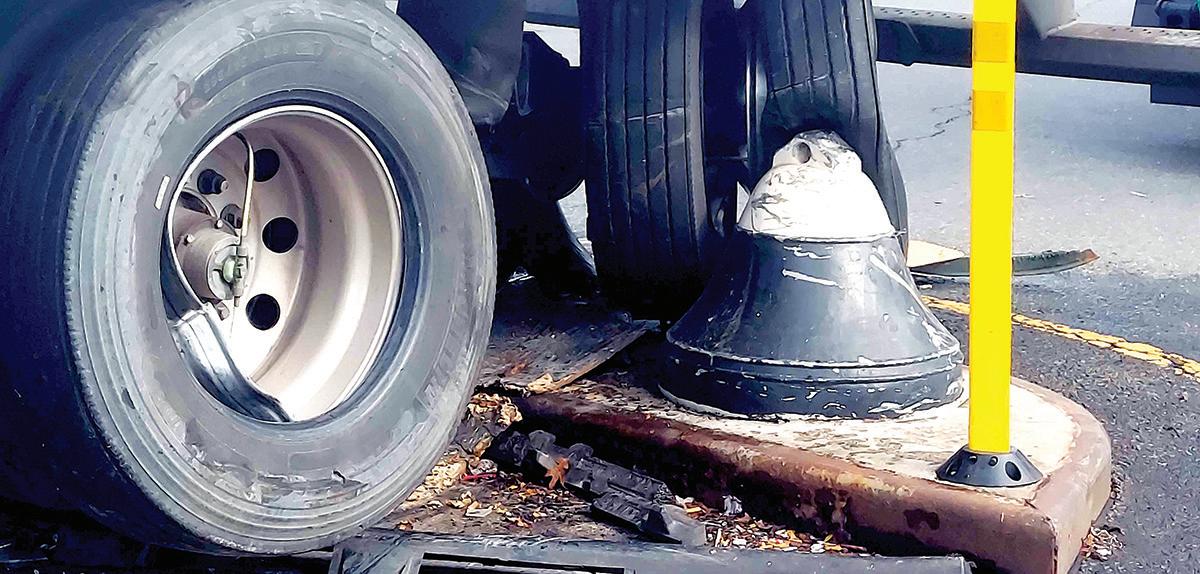 when the truck struck a traffic sign at the southwest corner of the intersection, causing damage to the sign and the lane divider.”