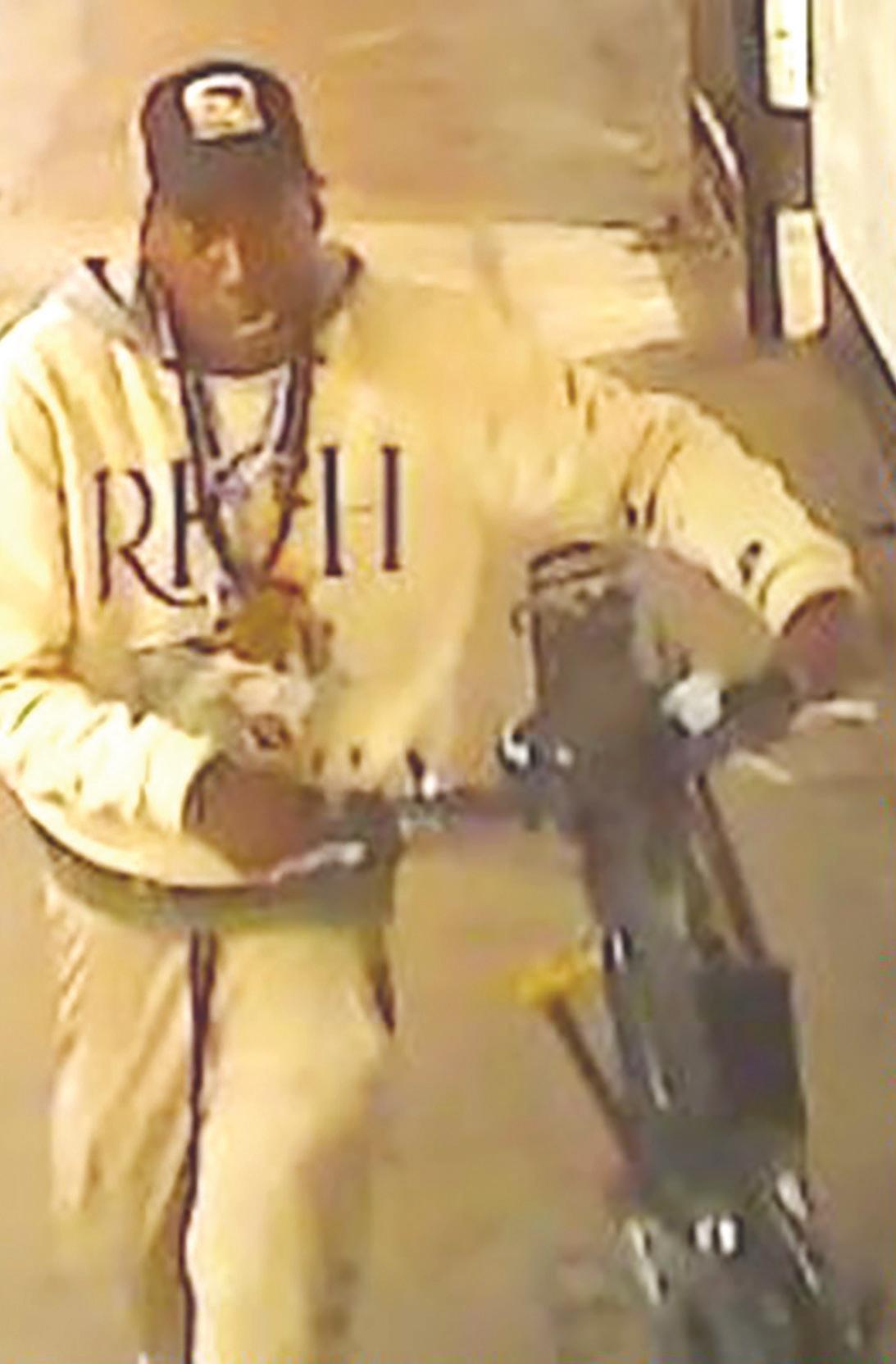 The first suspect is described as a male with a light complexion and a beard. He wore a dark hoodie.