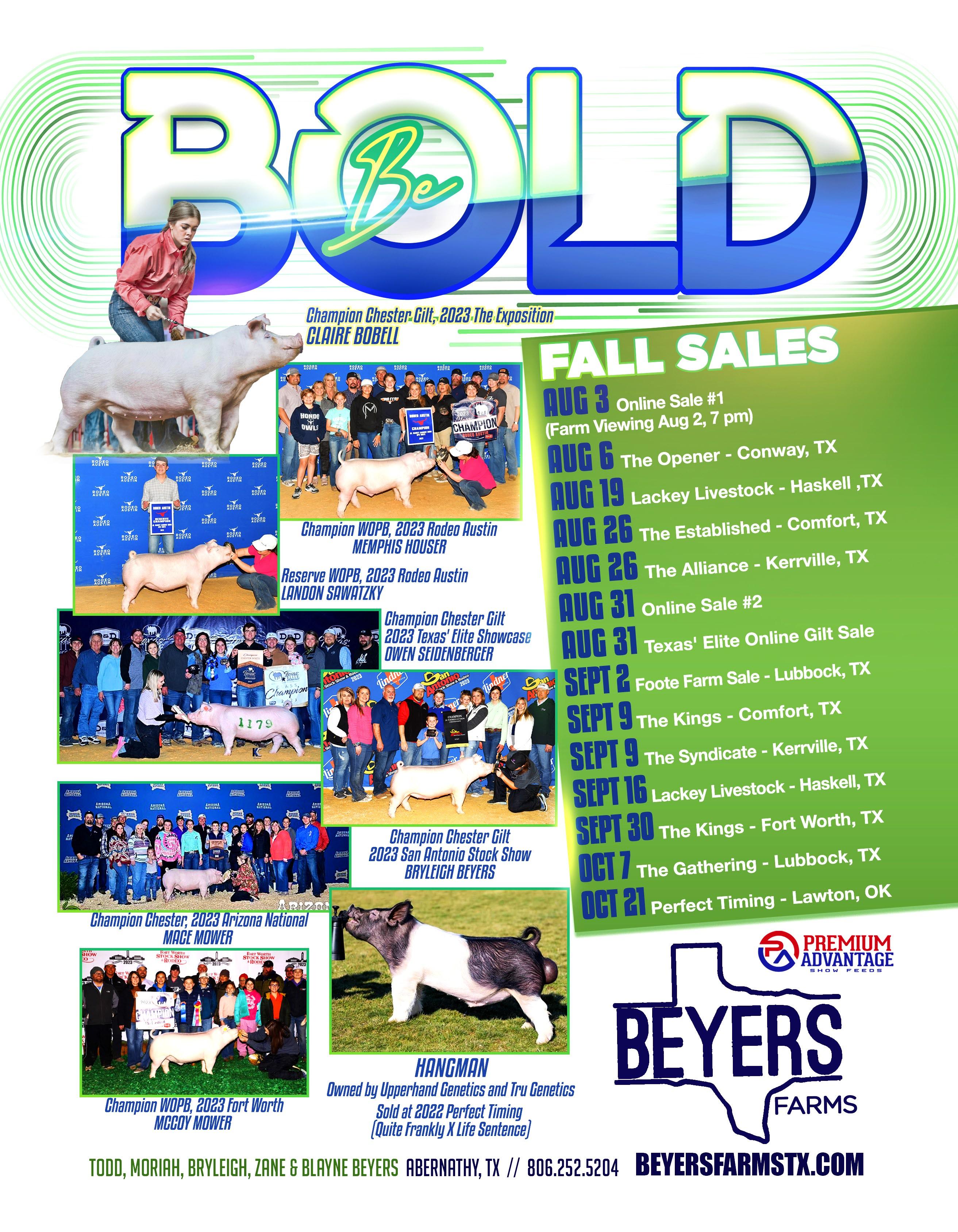 fall sales WWW.RAINSLIVESTOCK.COM FREDERICKSBURG, TEXAS CORY, LACEY, CRAYTON, COLE & CROSSON RAINS 325.236.0593 is ver. 8.15 8.19 8.26 8.29 9.8&9 9.16 10.7 ONLINEshowpig.com LACKEY FARM SALEhaskell, tx THE ALLIANCE kerrville, tx ONLINEshowpig.com THE KINGS #1comfort, tx LACKEY FARM SALEhaskell, tx THE GATHERING lubbock, tx FOLLOW US ON FACEBOOK FOR PRIVATE TREATY SALES 4