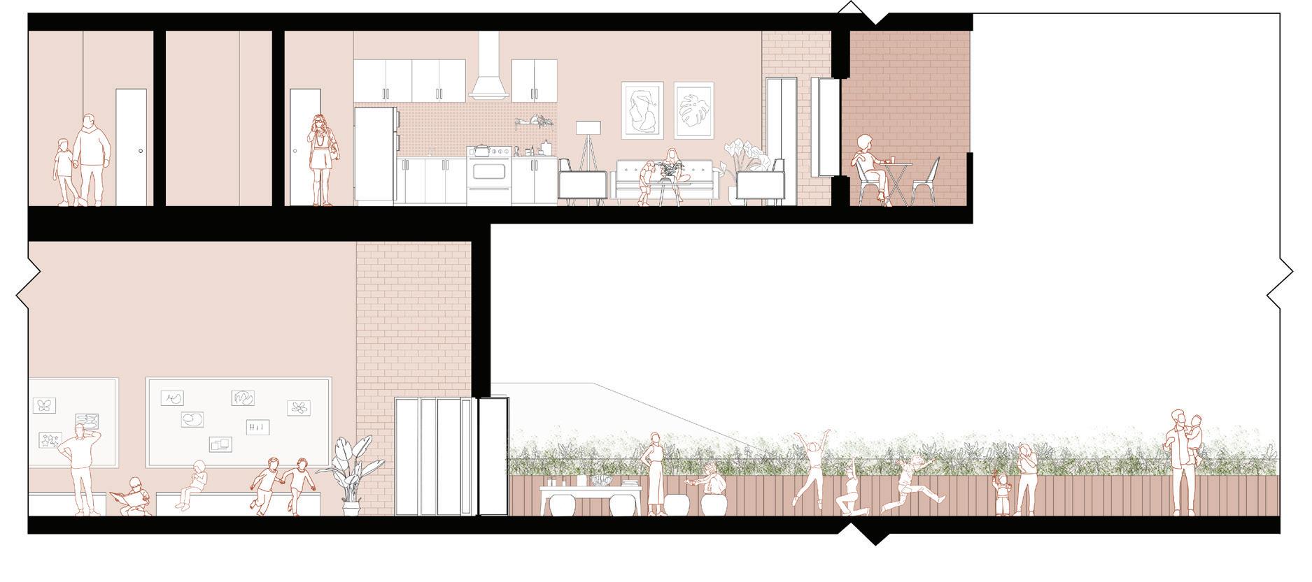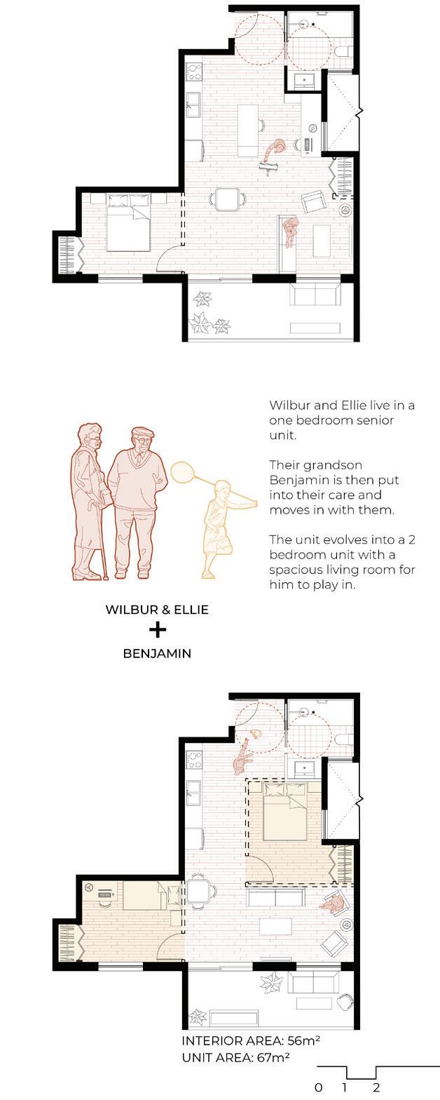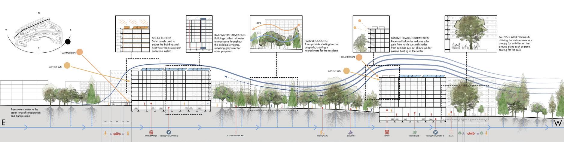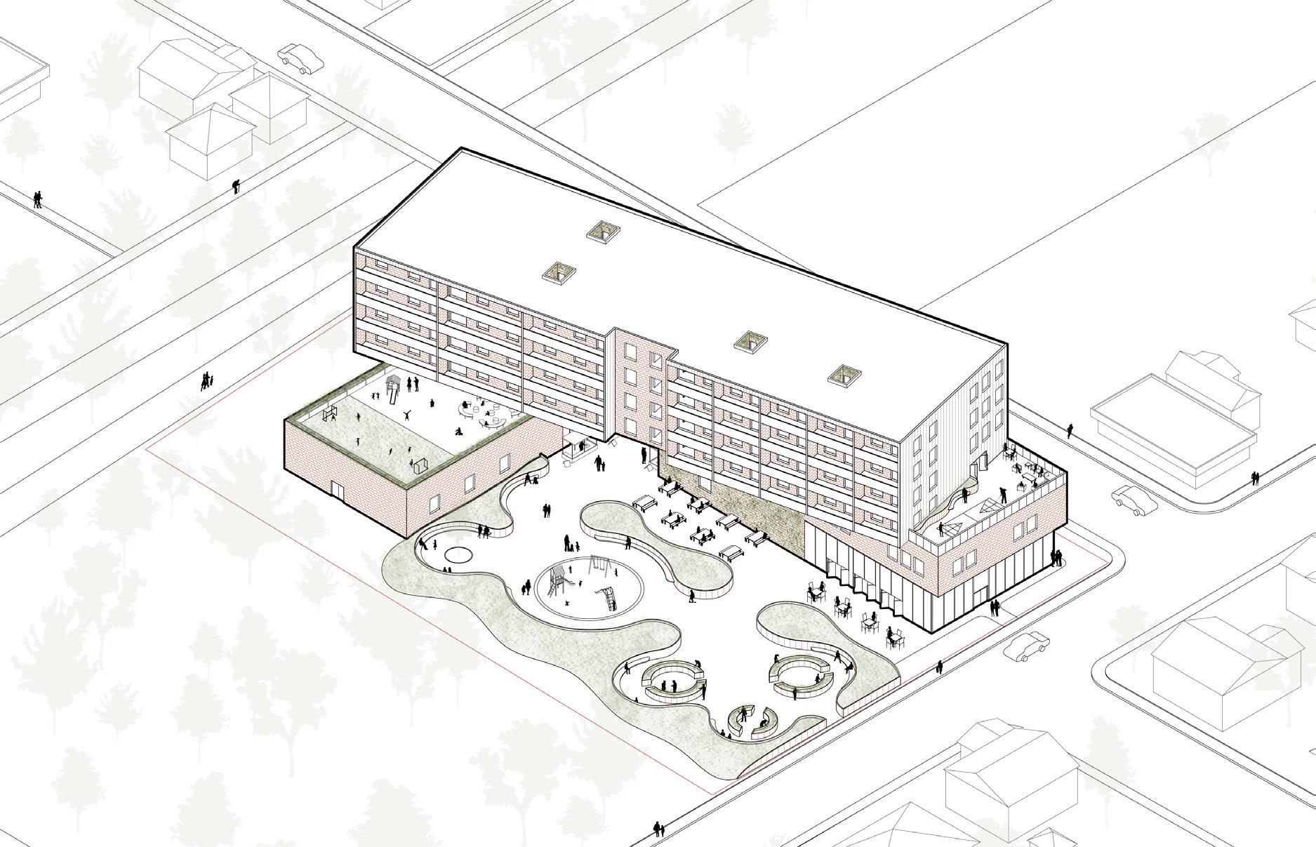 The revitalization of this empty lot seeks to combat the crisis of housing alienation. By embracing the residential community of Cambridge and providing a variety of services for all ages, this apartment building blurs the line between the surrounding residential population and the tenants on the site. With a focus on creating affordable housing for families and senior citizens, this apartment complex becomes a home that prioritizes nature, creativity and social interaction.