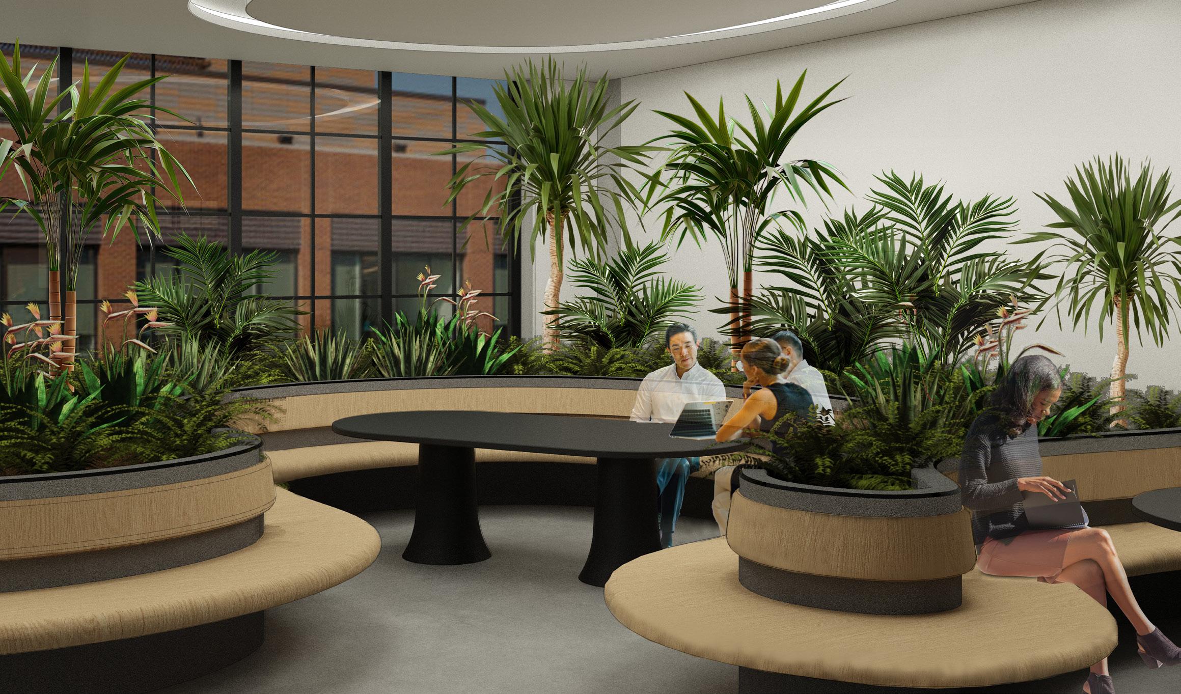 The Arboretum, the Wildcard space of NEXT’s office, is inspired by the lush beauty of the Garfield Park Conservatory. Curved wood benches wind themselves throughout the space, offering flexible areas for collaboration, relaxation, or rejuvenation. This space invites employees to gather, work together, or unwind in a calming environment surrounded by abundant greenery. The thoughtfully designed layout encourages both social interaction and quiet reflection, embodying NEXT’s commitment to nurturing creativity and well-being.
