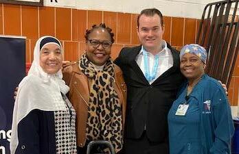 2) Community Constituent Services Resource Fair at Boys and Girls High School, hosted by Congressman Hakeem Jeffries, State Senator Zellnor Myrie, Assemblywoman Stefani Zinerman and Councilmember Chi Osse, on April 27. Sakibeh Mustafa, Community Liaison; Senator Myrie; Henry Kimball, MD, Internal Medicine Resident; and Dady Joseph, PCA.