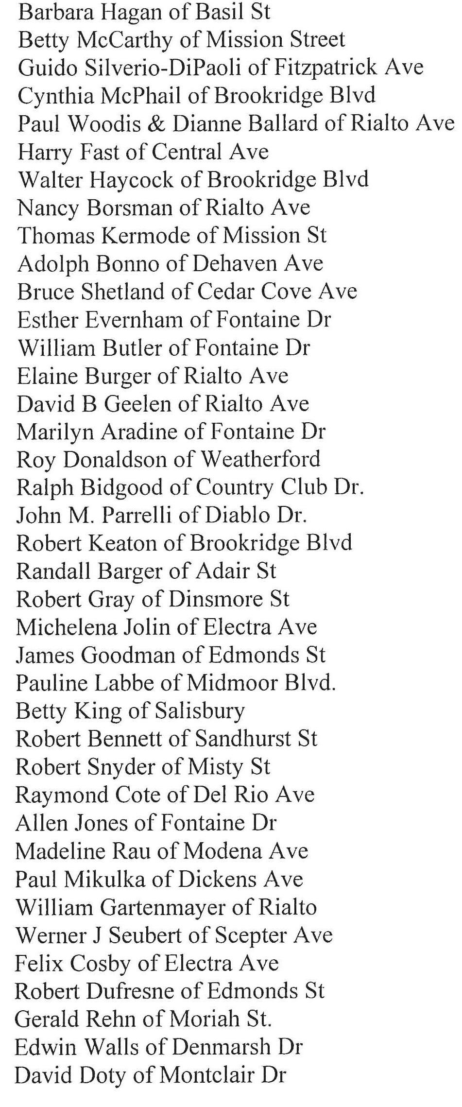 1 Crime Watch..................................................9:00 am 1 CERT 10:00 am 3 Friday Nite Bingo........................................5:00 pm 4 Social Dance 7:00 pm 6 All-Stars Entertainment............................6.55 pm 7 BCPO BOD Workshop..............................9:00 am 7 Tuesday Night Bingo.................................5:30 pm 8 Night at the Horse Races........................5:00 pm 9 Beautification Committee Meeting......9:00 am 9 Brookridge Entertainment......................7:00 pm 11 AARP Safe Driving Class.........................10:00 am 11 Line Dance Social.........................................6:00 pm 12 Brookridge Singles....................................6:00 pm 13 ACC Meeting.................................................9:00 am 13 Friday Nite Bingo Meeting......................11:00 am 13 BCCGA BOD Meeting—Pro Shop 7:00 pm 13 Ladies 18-Hole League Meeting............9:00 am 14 Unit Representative Meeting.................9:00 am 15 Annual BCPO Members Meeting........7:00 am 15 RV Compound Walk-Thru......................10:00 am 16 AVRC Meeting.............................................9:00 am 18 Mens Club Community Breakfast.........7:00 am 18 Dream Team.................................................2:00 pm 19 Beautification Card Party 11:00 am 19 Music Aires Concert...................................3:00 pm 20 Veterans Committee Meeting..............11:00 am 20 Ladies of Brookridge Meeting............12:00 pm 22 RV Compound Meeting...........................11:00 am 22 Music Aires Combo Recital....................1:30 pm 26 Ryder Cup Dinner......................................6:00 pm 29 Blood Mobile 10:00 am th th th st (Also 10 , 17 24 31 ) th (Also 26 ) th (Also 27 ) th st th (Also 14 , 21 , 28 ) MARCH 8 BROOKRIDGE MEN'S CLUB HORSE RACES @ 5:00 PM MARCH 18 BROOKRIDGE MEN'S CLUB BREAKFAST @ 7:00 AM MARCH 15 BCPO ANNUAL MEMBERS MEETING @ 7:00 PM MARCH 29 BLOOD MOBILE @ 10:00 AM MARCH 14 BCPO BOD ELECTION VOTE COUNTING @ 9:00 AM MARCH 19 BEAUTIFICATION CARD PARTY @ 11:00 AM AARP Safe Driving Class.....................................pg 37 Architectural Control Committee.....................pg 14 Beautification.............................................................pg 8 BINGO........................................................................pg 42 Board Of Directors .................................................pg 4 BOD Meeting Minutes..............................................N/A Brookridge Singles................................................pg 39 Calendar.............................................................pgs 26,27 CERT.............................................................................pg 15 Clubhouse & Office News......................................pg 6 Clubs & Committees Contacts ...........................pg 7 Code Enforcement.................................................pg 14 Crime Watch............................................................pg 30 Entertainment...........................pgs 18,19,22,23,46,49 Important Numbers & Info..............................pgs 3,9 Ladies of Brookridge.............................................pg 12 Memorial.....................................................................pg 13 Monthly Events...................................................pgs 8,12 Mens Club...................................................................pg 12 N&V Guidelines..........................................................pg 3 Poem............................................................................pg 16 President Report......................................................pg 11 Religion.........................................................pgs 31,32,33 RV Compound.........................................................pg 25 Sports-Fitness....................................pgs 28,29,30,48 Treasurer’s Report.....................................................N/A Water Restrictions.................................................pg 25 Veterans..............................................................pgs 15,34
